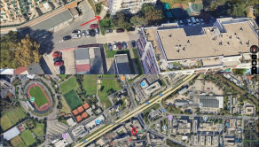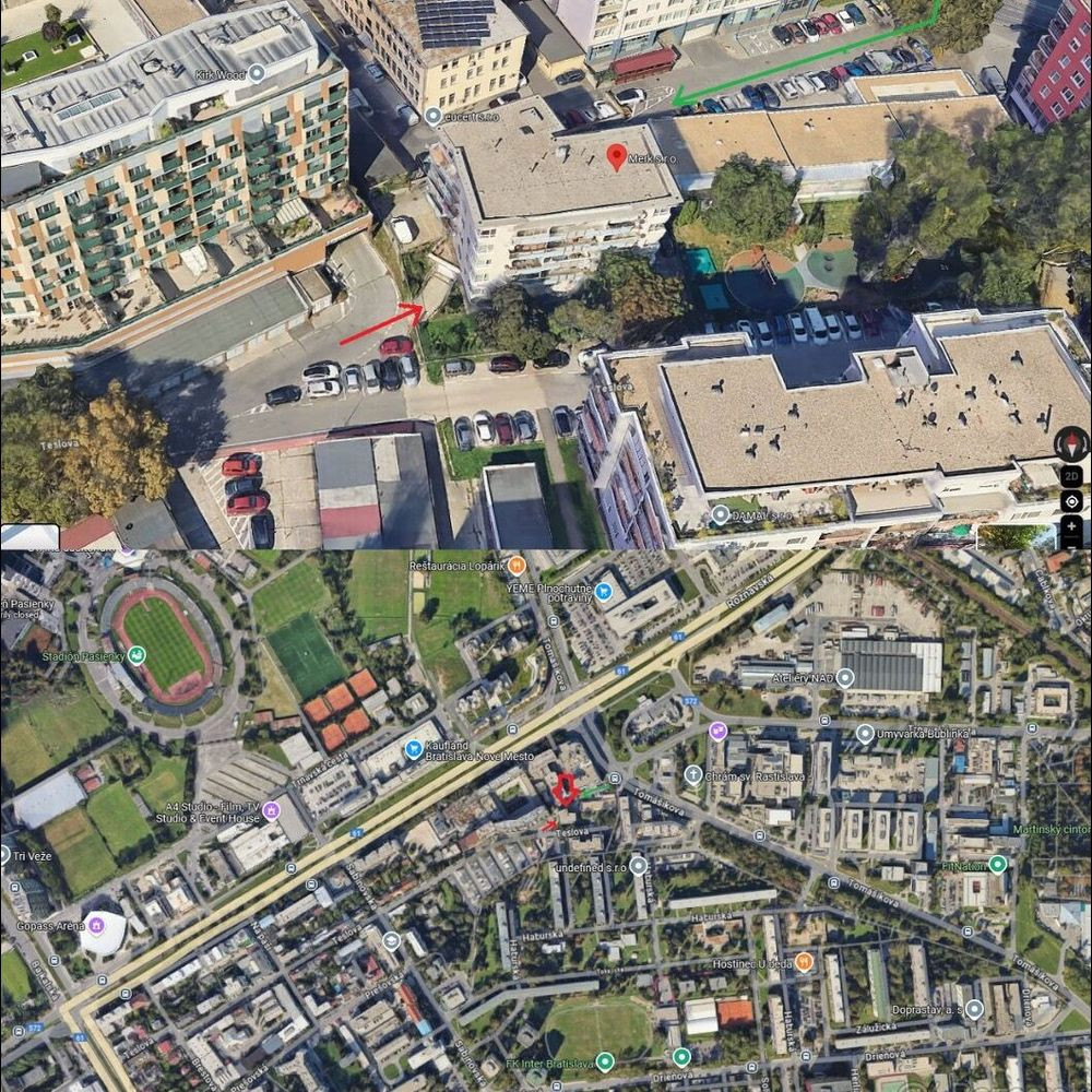 Vchod a východ pre chodcov je možný z ulice Tomášikova aj Teslova - zvýraznené zelenou a červenou šípkou na mapke z google maps