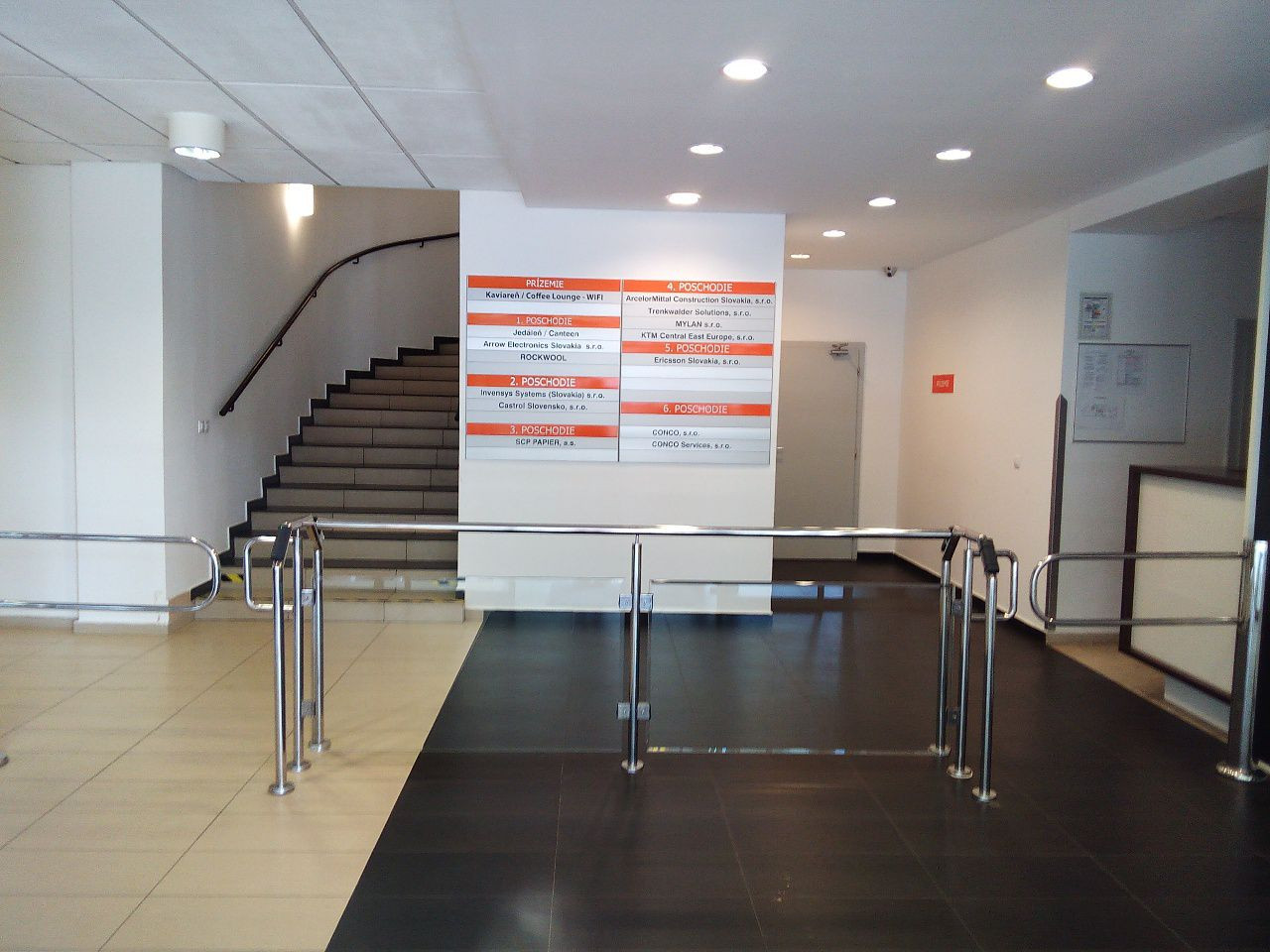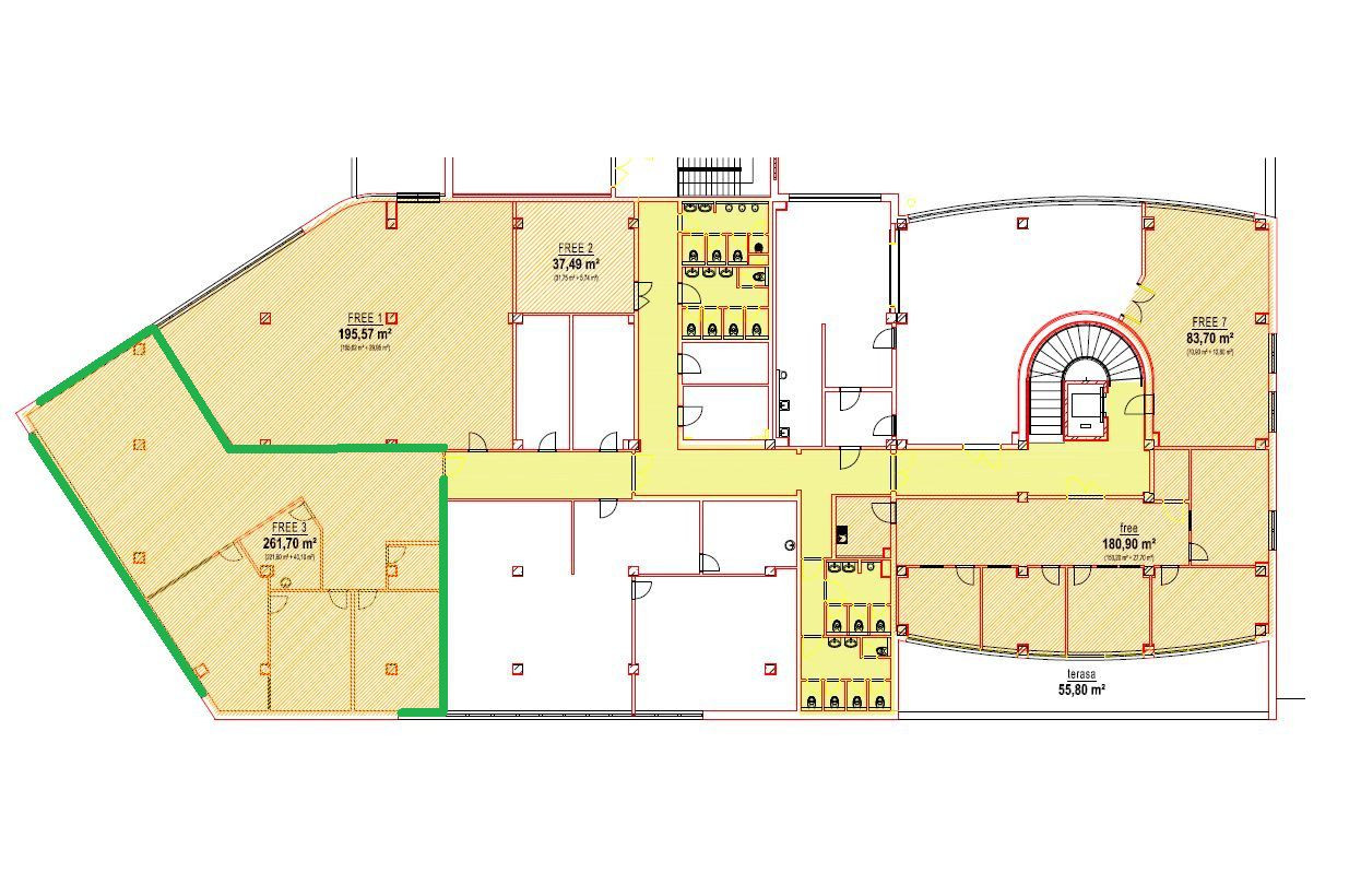K dispozícii je uzavretý celok celkovej veľkosti 261,7 m² (na 1.p., výťah). Je delený na 1 veľký openspace + 5 miestností + kuchynka, ale dá sa dispozične zmeniť. Priestory sa odovzdávajú vybudované v štandarde, na základe požiadavky klienta (priečky, podhľady, koberec, vykurovanie, klimatizácia). V budove je aj jedáleň. Klientské parkovanie pred budovou.