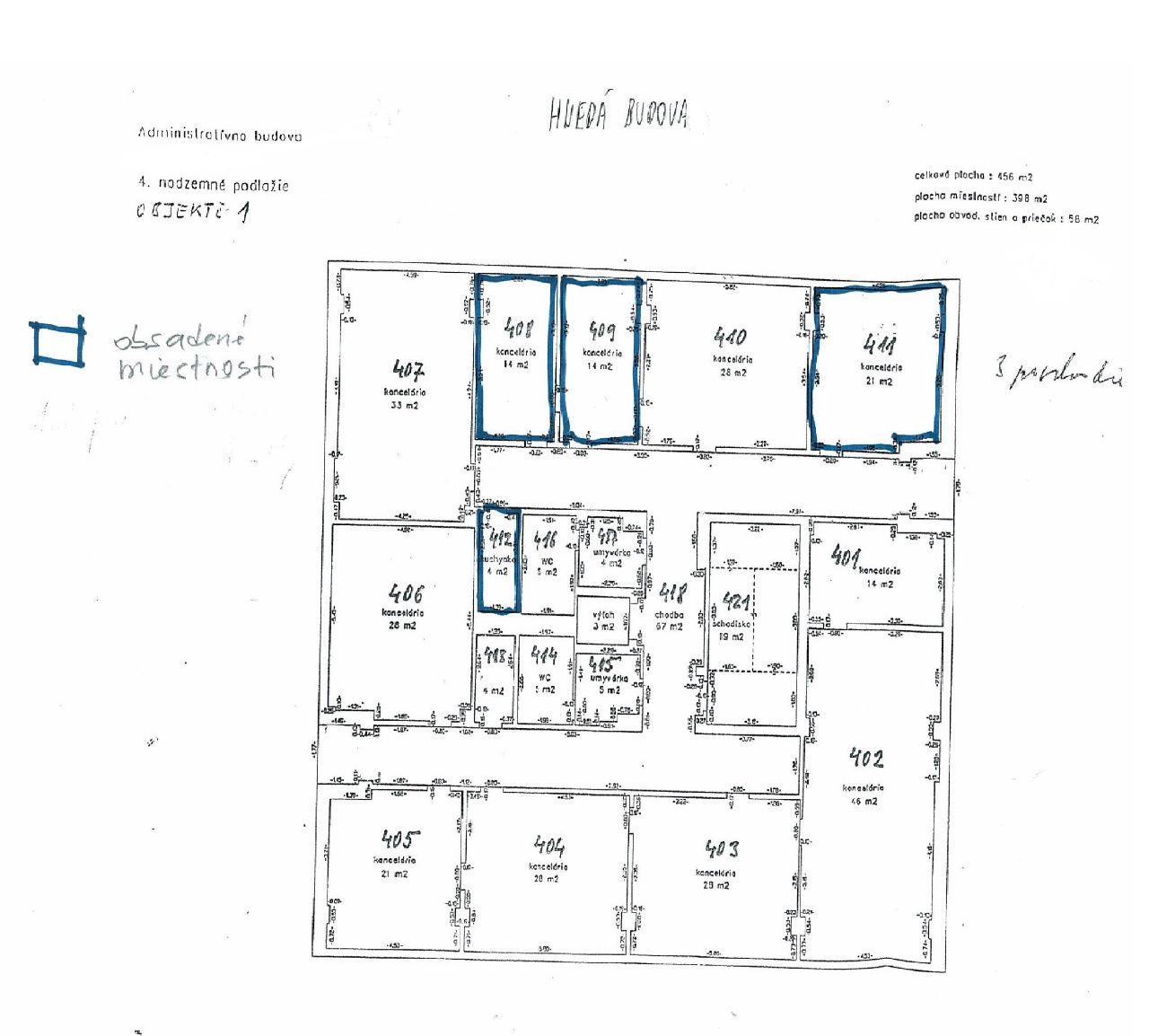 Napr. nájom 3 kancelárii na 3.p, celk. výmery 88 m2 (14+46+28 m2) je 841 €/mesiac + energie.
