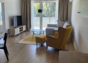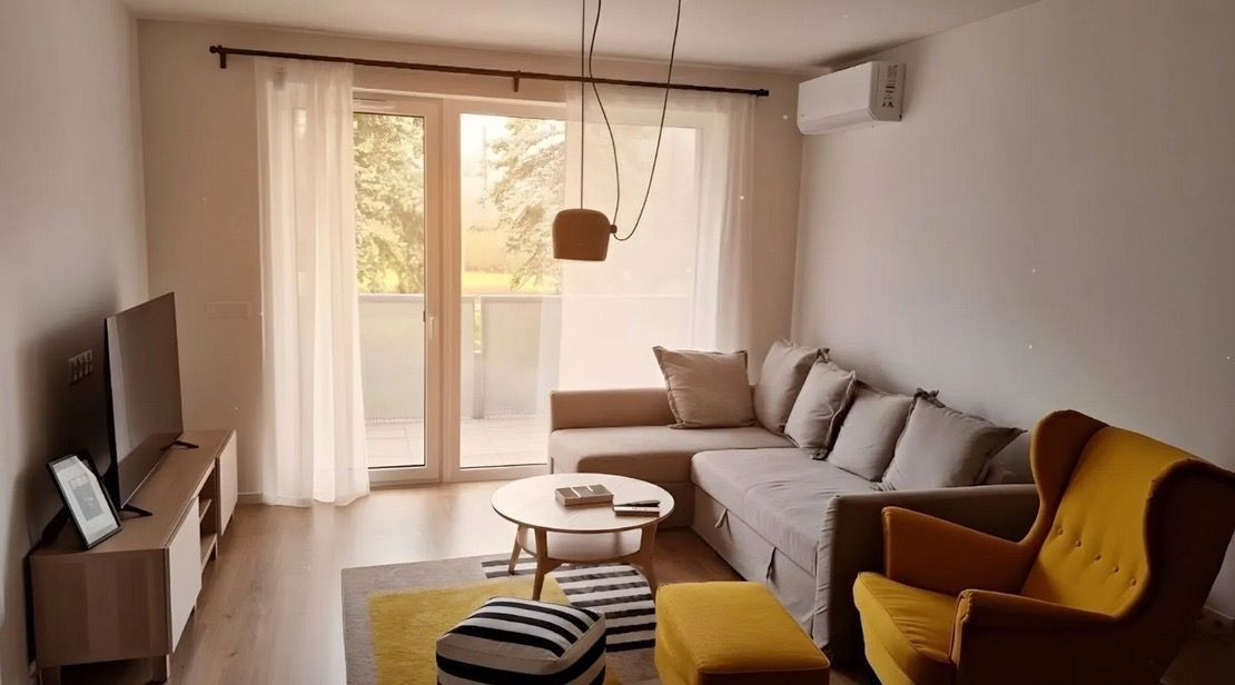 obývacia časť: Smart TV, TV stolík, gauč, kreslo, koberec, konferenčný stolík, záclony