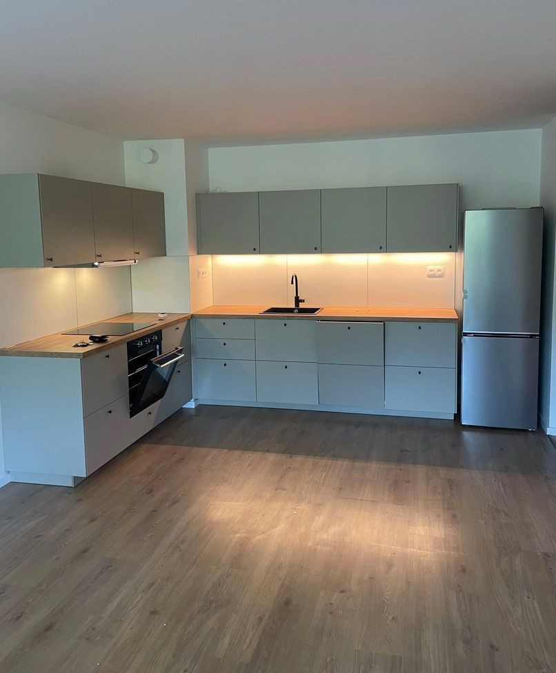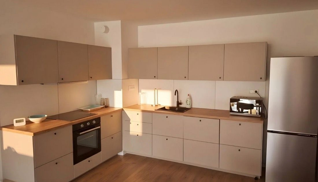 moderná kuchynská linka so spotrebičmi (chladnička, umývačka riadu, indukčná varná doska s rúrou, mikrovlnná rúra)