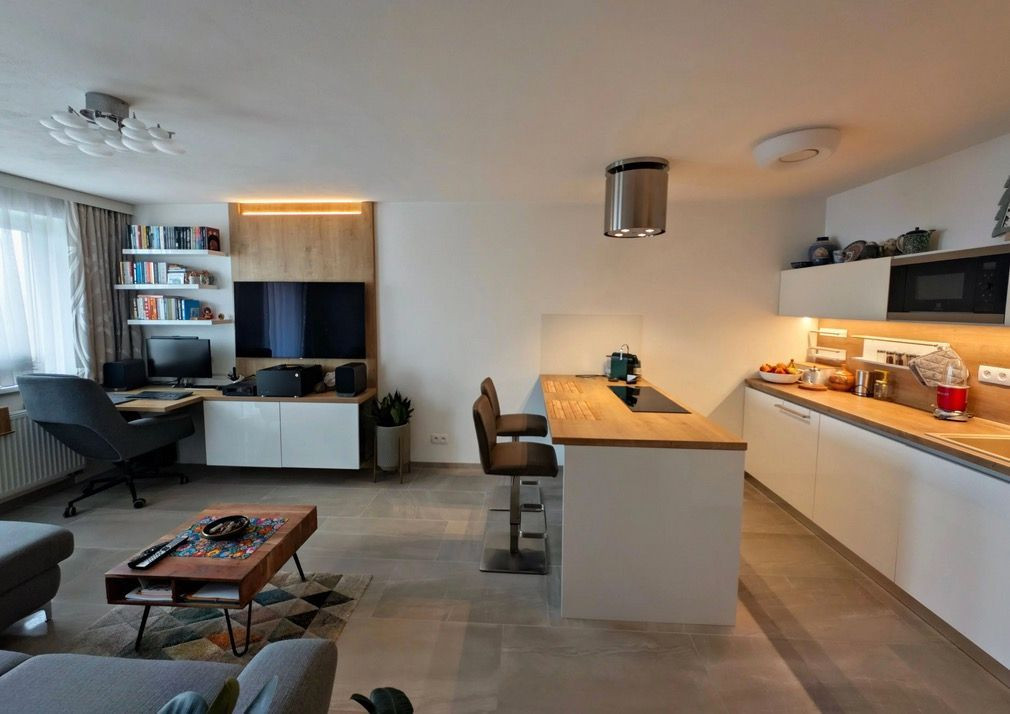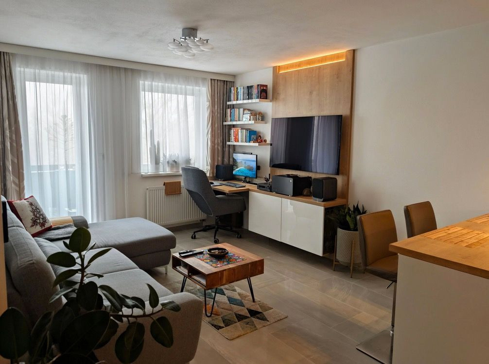 V obývačke sa nachádza kancelársky stôl s kreslom, ktorý nadväzuje na TV skrinku s barom, nad ktorou sa nachádza OLED TV LG 55 osadená priamo na obývačkovej stene v drevenom dekore. Pri protiľahlej stene sa nachádza veľká rozkladacia dvoj-lôžková sedačka s úložným priestorom a s konferenčným stolíkom. Z obývacej izby je prístup na balkón s výhľadom do Mlynskej doliny a Slávičieho údolia.