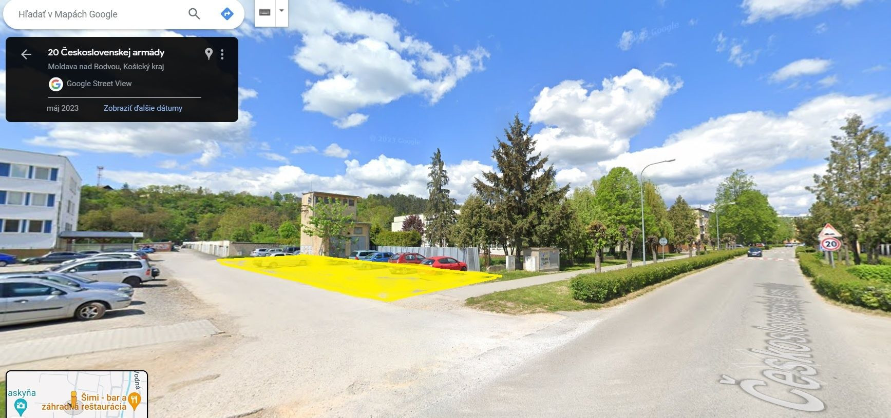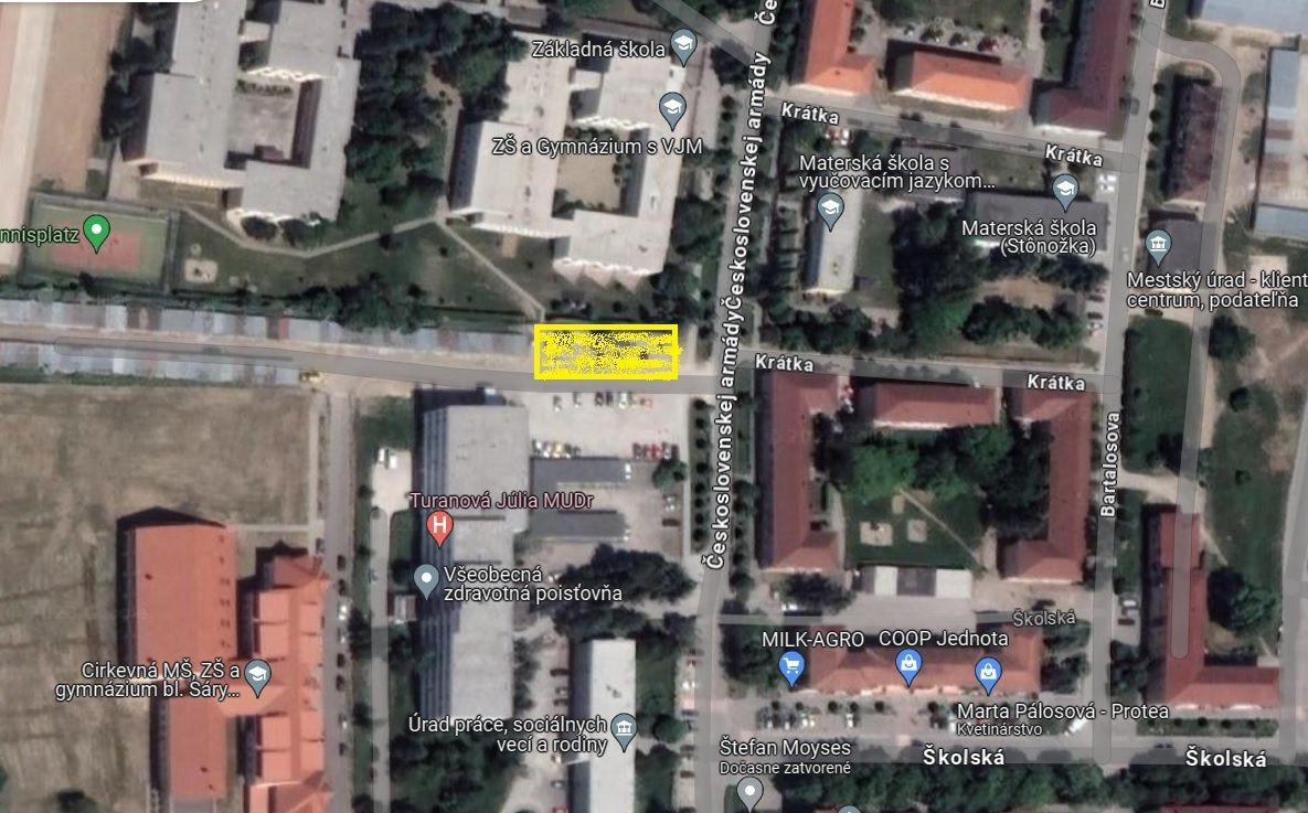 Pozemok s výmerou 534m2 sa nachádza v centre mesta, na ulici Československej armády (križovatka s Krátkou). K pozemku je vydané stanovisko mesta k funkčnému využitiu podľa platného územného plánu - pozemok je určený pre výstavbu garáží. Pravidelný obdĺžnikový tvar 45x12m, rovina, prístup z asfaltovej cesty.