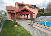 Za živým plotom, ktorý zabezpečuje dokonalé súkromie je veľký altánok a krytý bazén. Priamo na pozemku za bránou na diaľkové ovládanie sú aj tri parkovacie miesta. Časť pozemku je vysadená ovocnými drevinami, s dostatkom priestoru na vybudovanie malej úžitkovej záhradky.