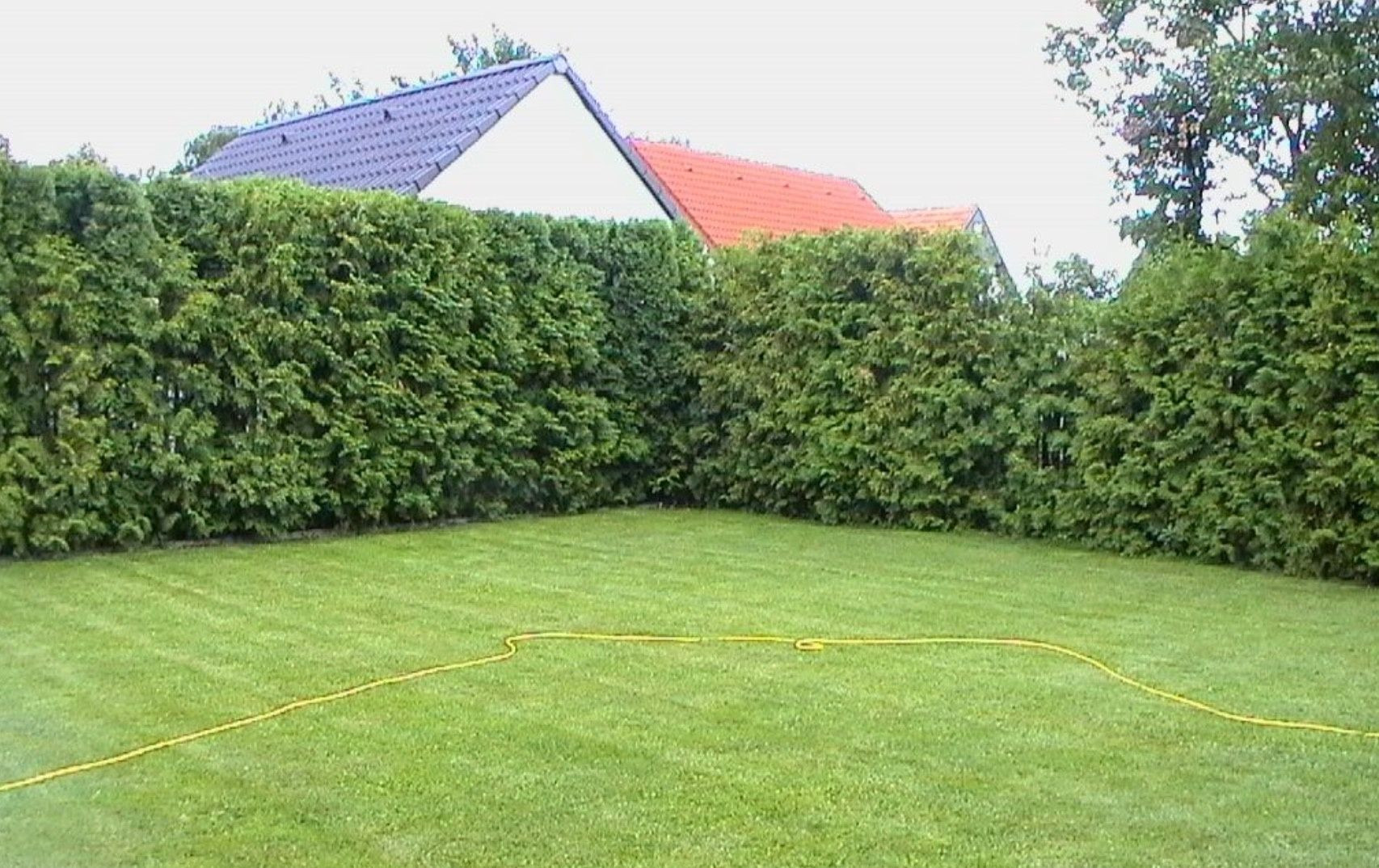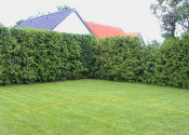 Záhrada je riešená zeleným trávnatým porastom a dookola plotu osadené tuje smaragd. Nová výsadba tují prebehla pred rokom.