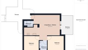 Informácie o apartmáne: rozloha 73m2, terasa 15,7 m2, veľká obývacia izba, dve dvojlôžkové izby, 2 kúpeľne, spoločný bazén.