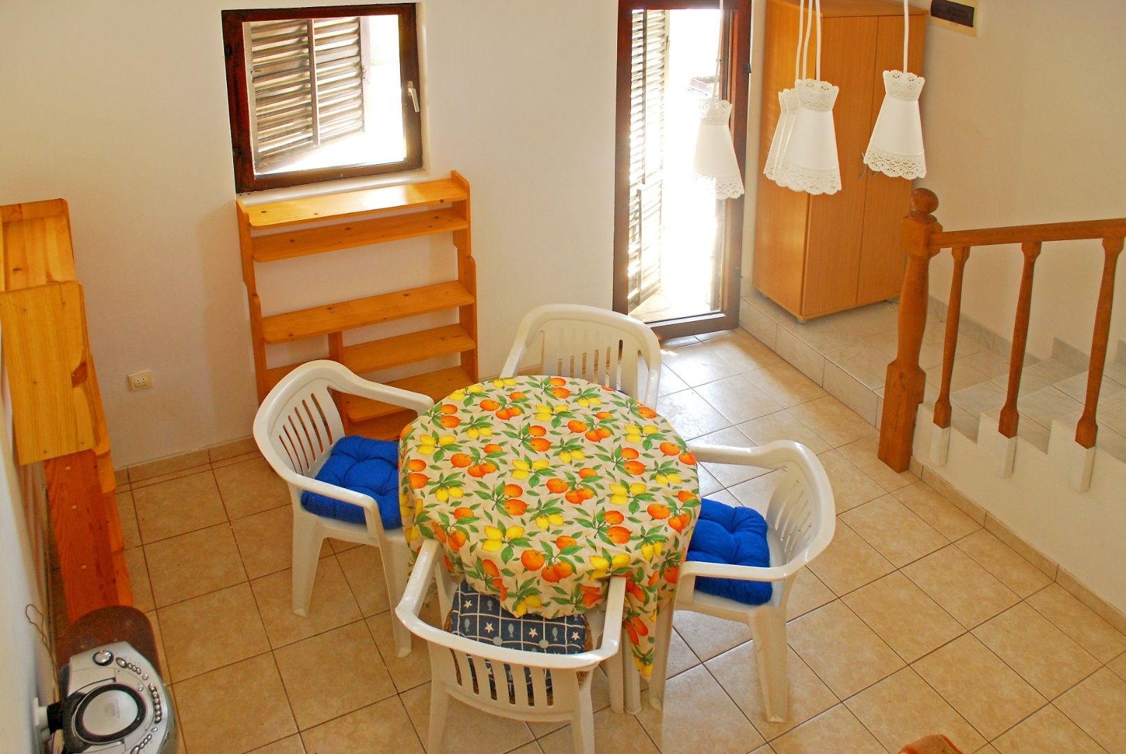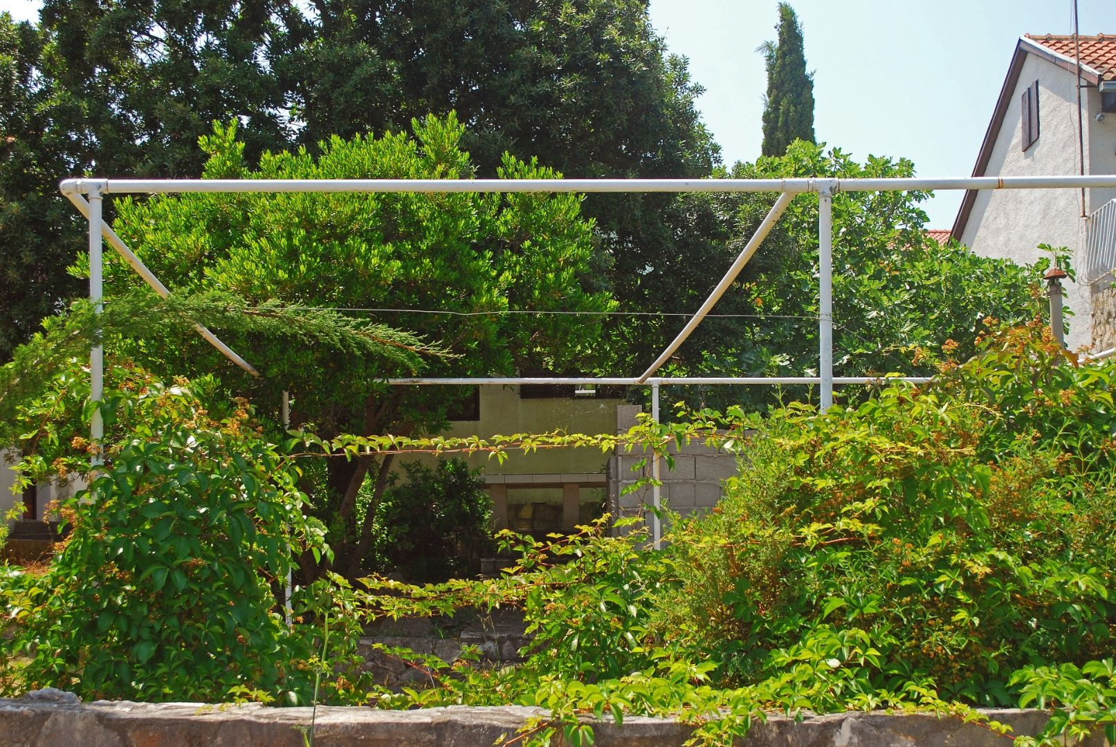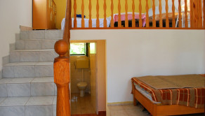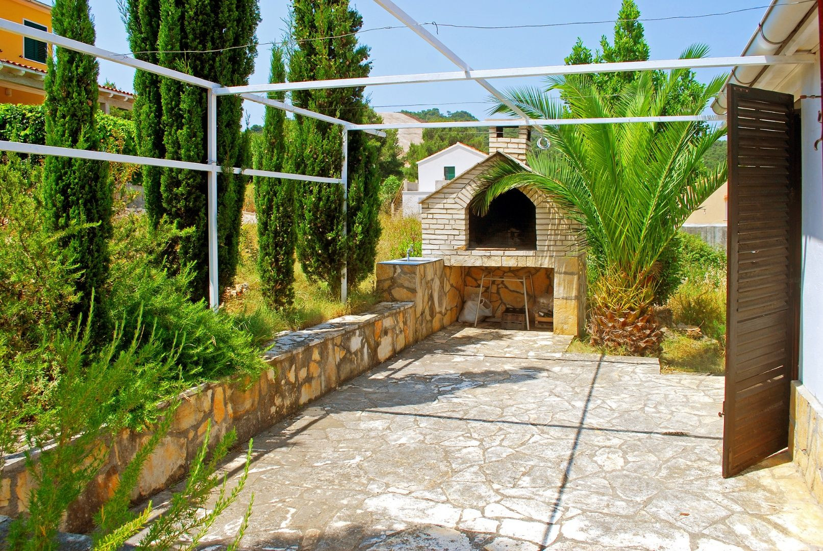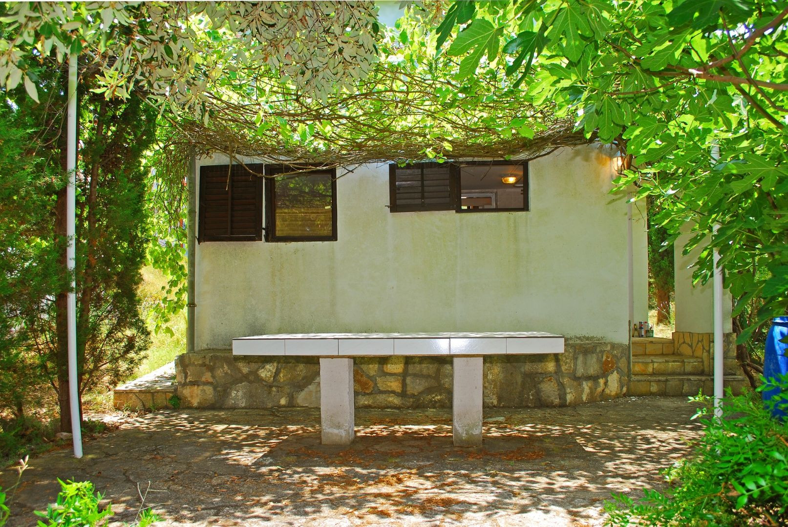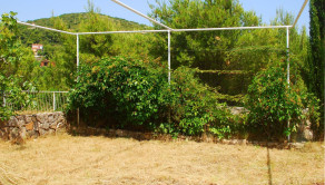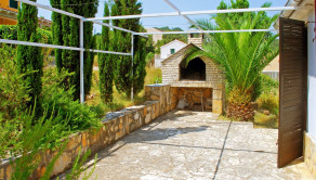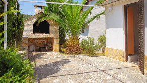 Dve terasy obklopujúce dom ponúkajú maximálny pôžitok z pobytu vonku. Predná terasa je pokrytá viničom, ktorý vytvára prirodzený tieň počas horúcich letných dní. Zadná terasa, vybavená veľkým kamenným grilom, pozýva na príjemné stretnutia a jedlá pod holým nebom. Celková plocha pozemku je 268 m², čo poskytuje dostatok priestoru na záhradkárske aktivity alebo relaxáciu v prírodnom prostredí.