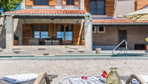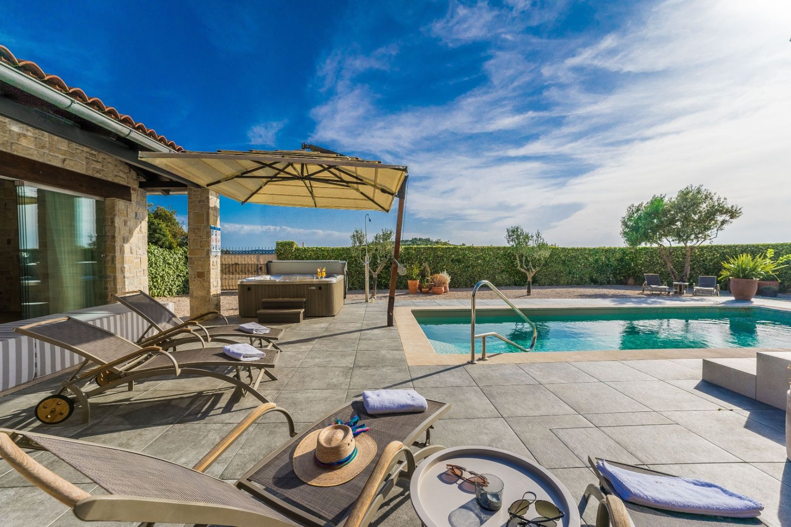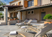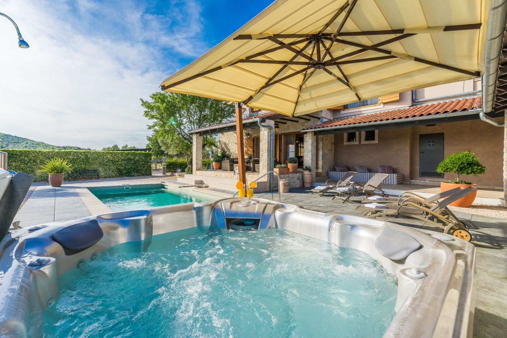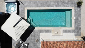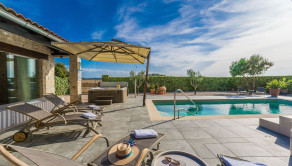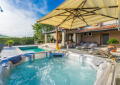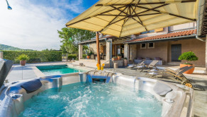 V nadväznosti na dom sa nachádza technická miestnosť, grilovacia miestnosť, miestnosť na biliard s posuvnou stenou a krytá terasa na každodenný oddych. Pred domom je bazén so slanou vodou, vírivka a slnečná terasa.