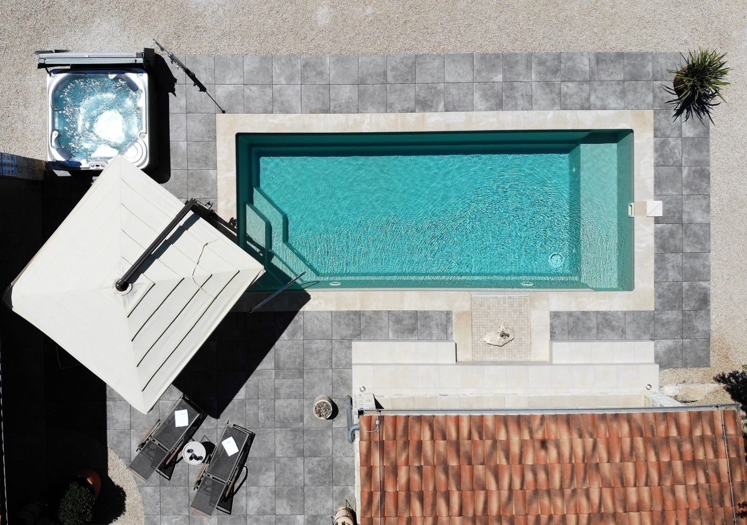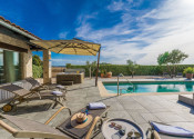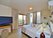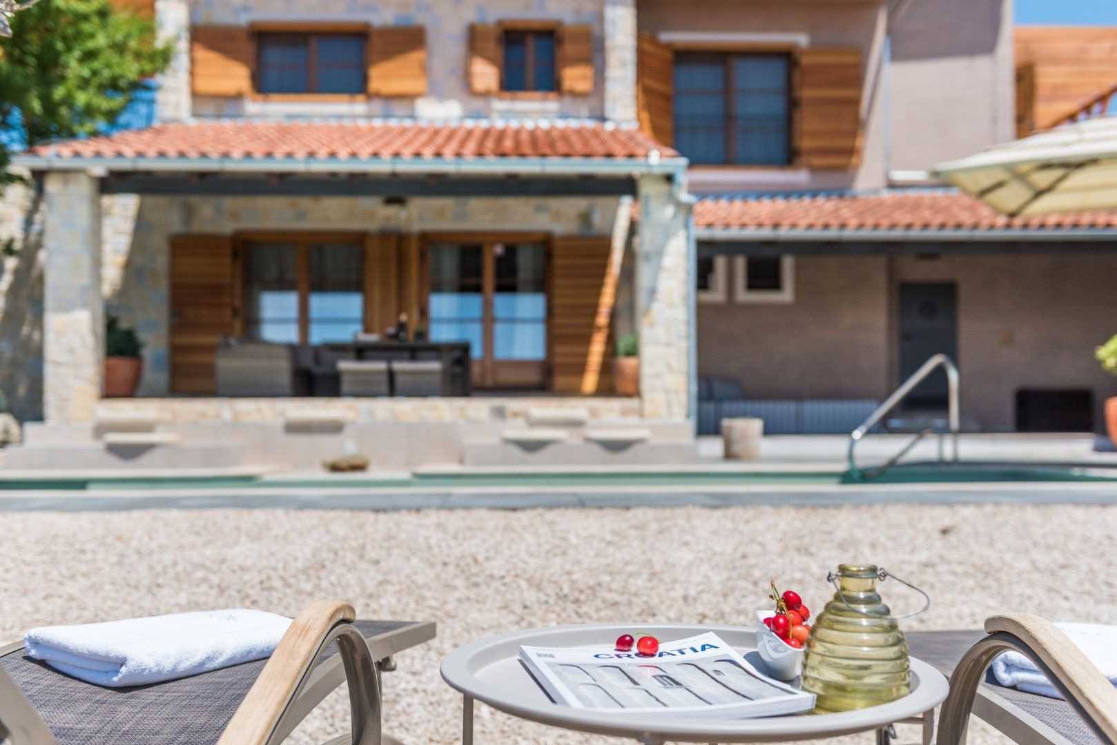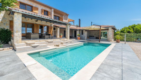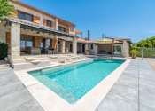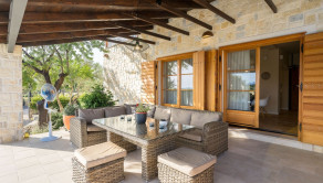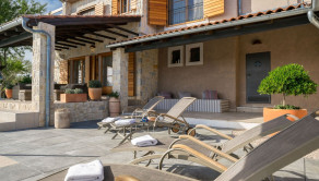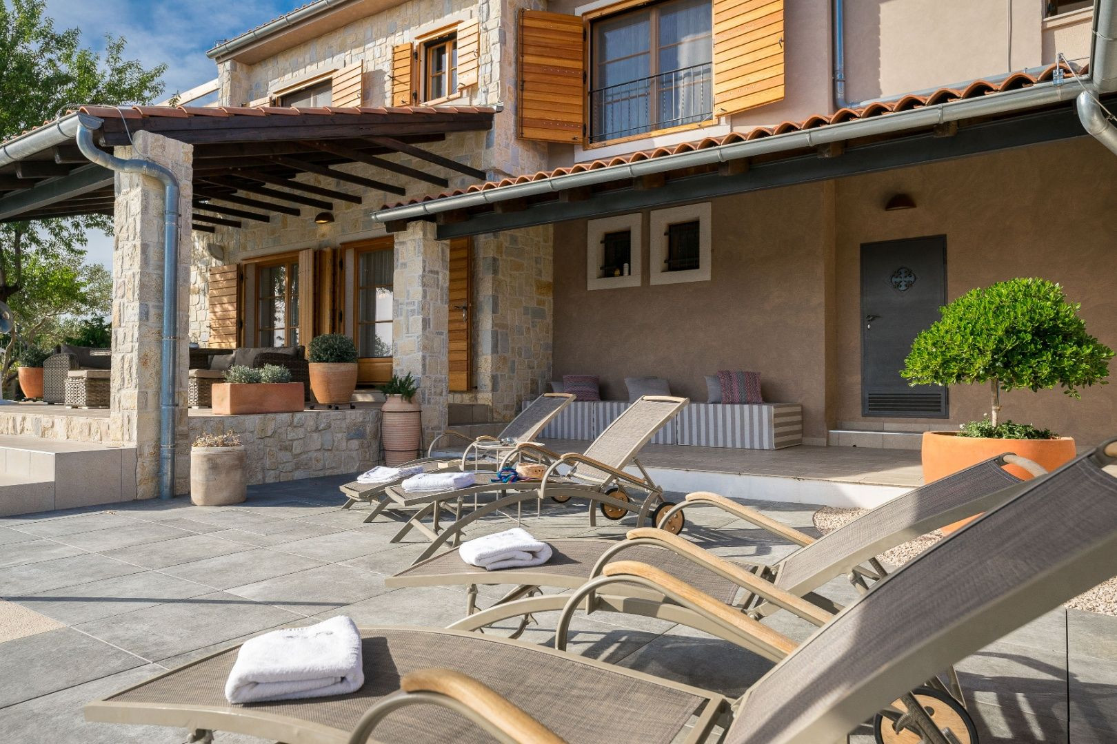 V nadväznosti na dom sa nachádza technická miestnosť, grilovacia miestnosť, miestnosť na biliard s posuvnou stenou a krytá terasa na každodenný oddych. Pred domom je bazén so slanou vodou, vírivka a slnečná terasa.