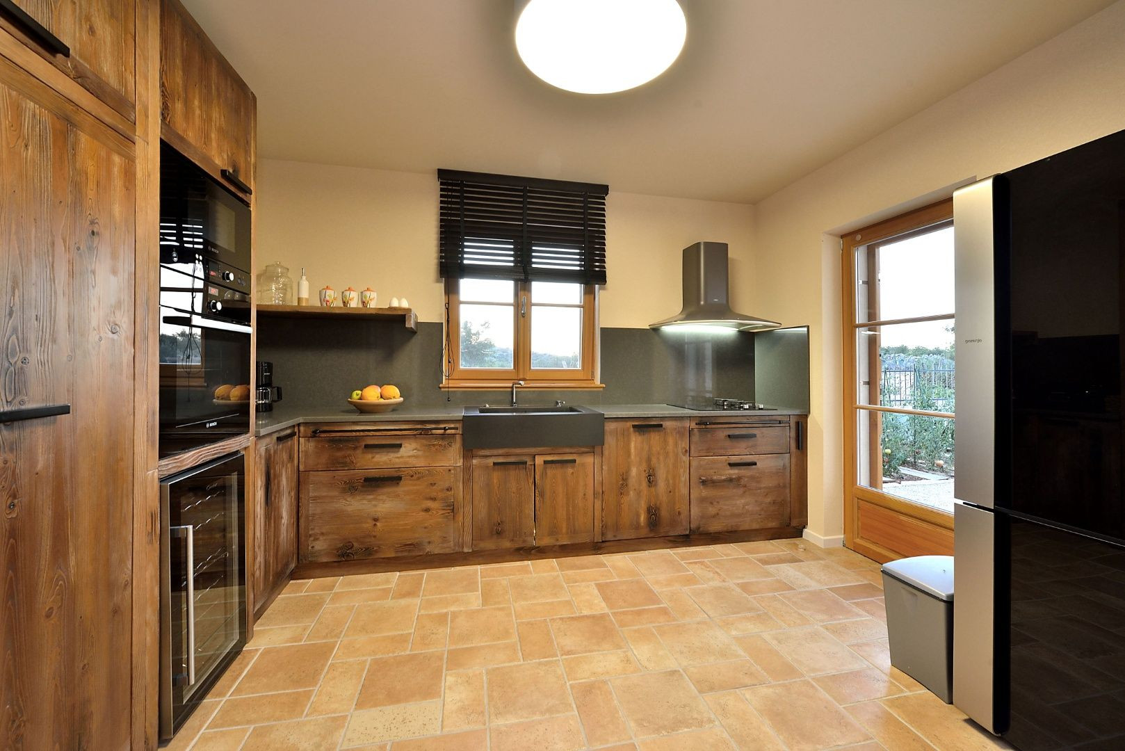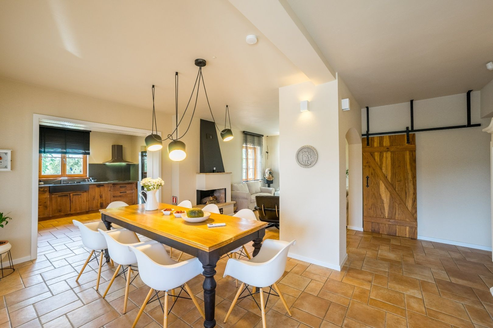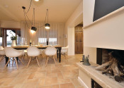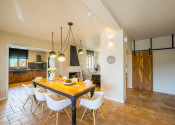 Prízemie domu zahŕňa kuchyňu, jedáleň, obývaciu izbu s ručne vyrobeným krbom, spálňu s kúpeľňou, toaletu a práčovňu. Na poschodí sú tri spálne, každá s vlastnou kúpeľňou, sauna a dve kryté terasy.