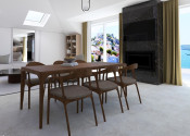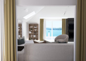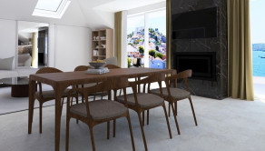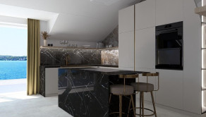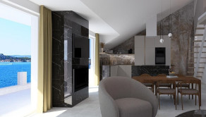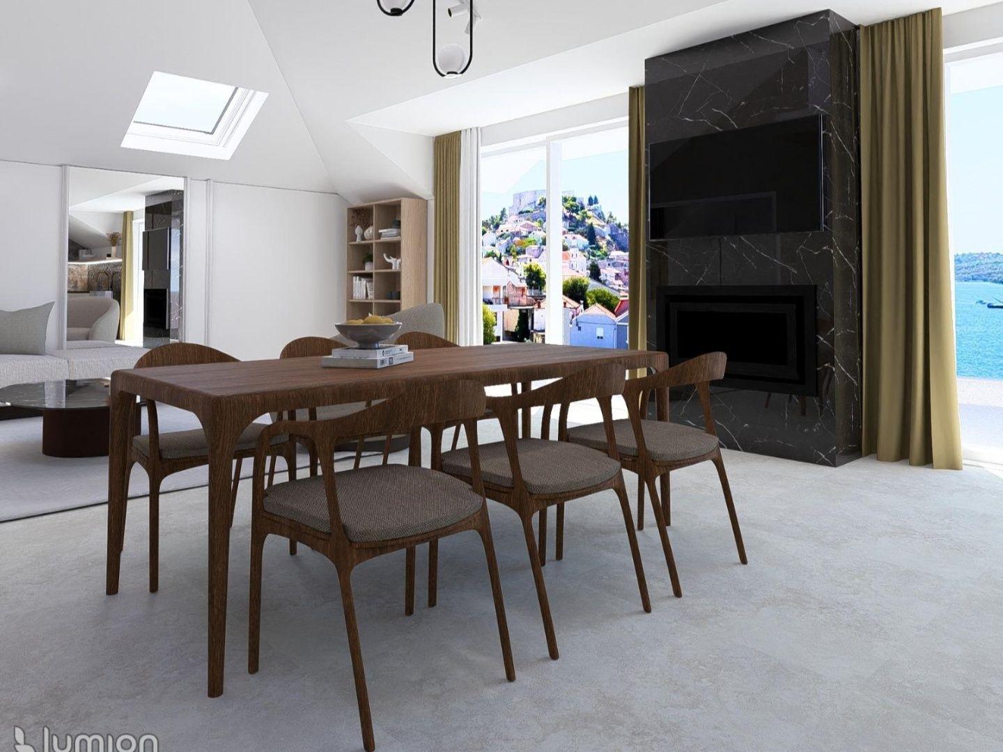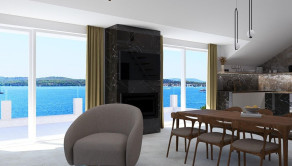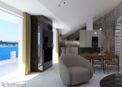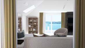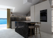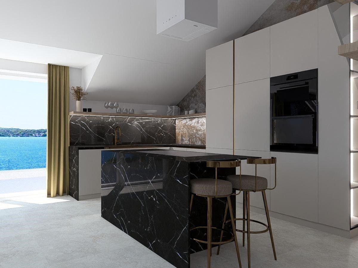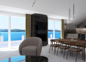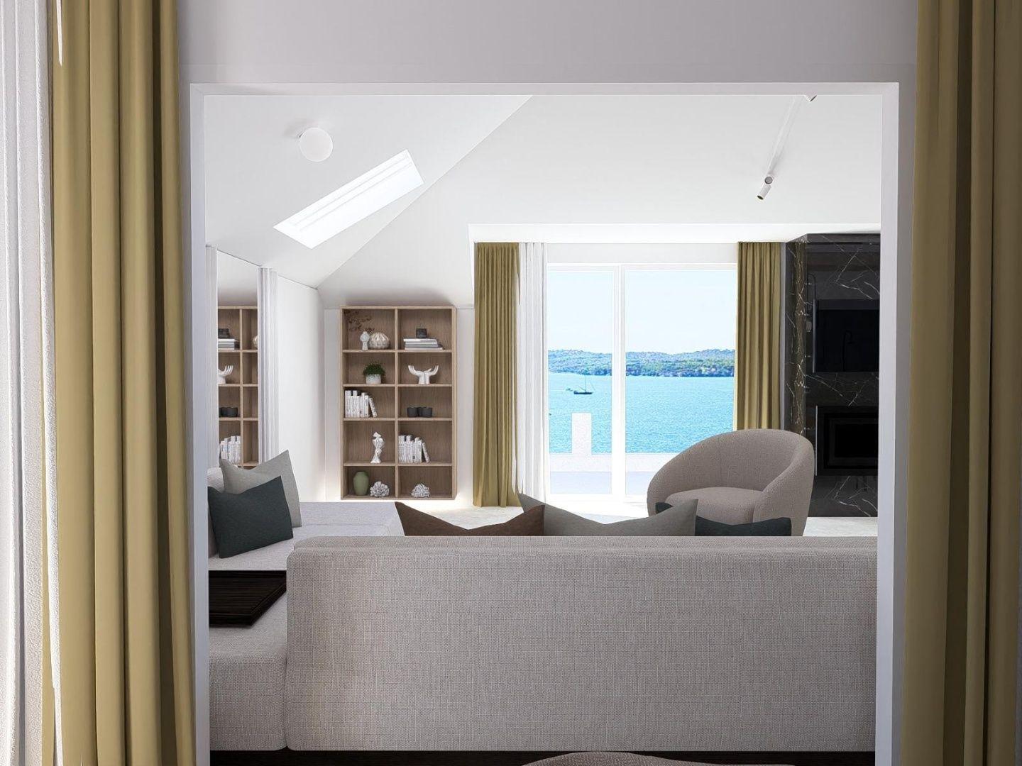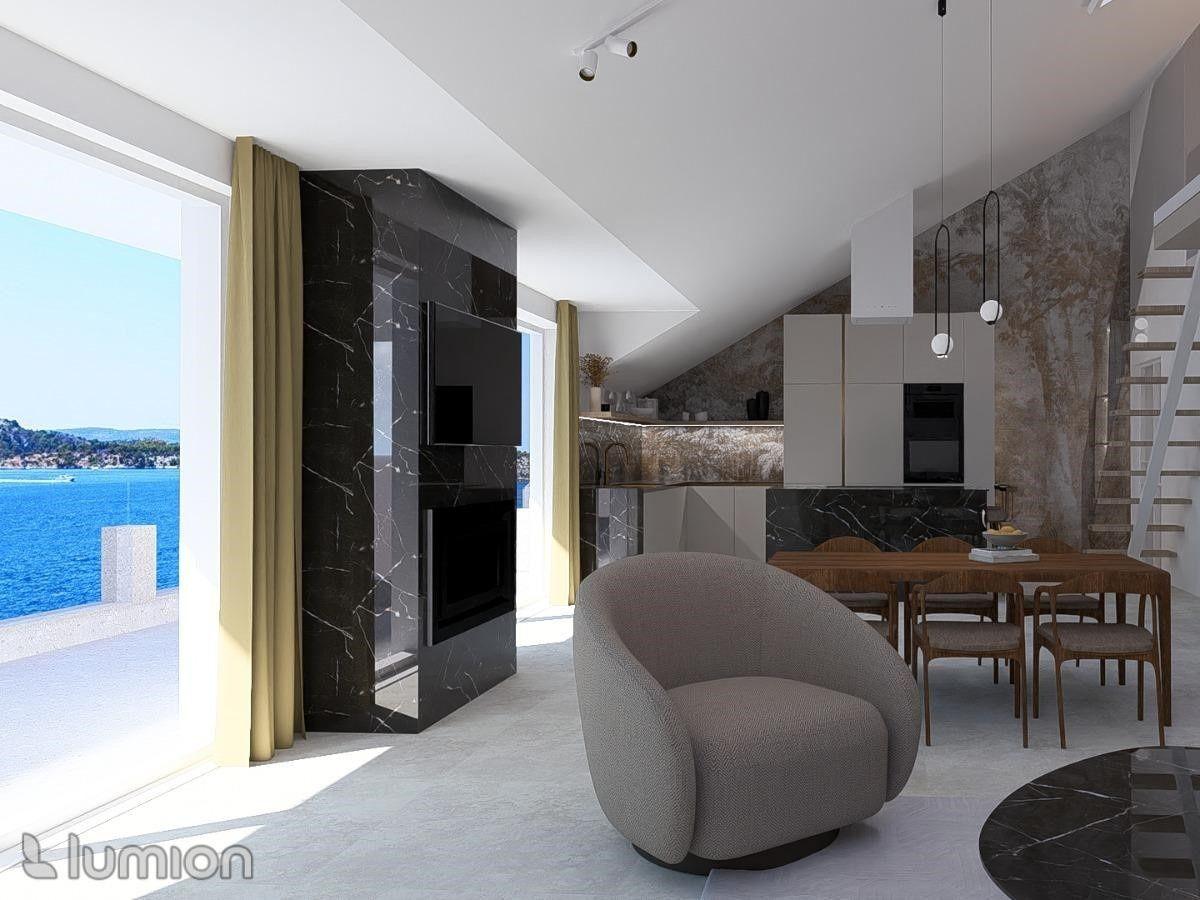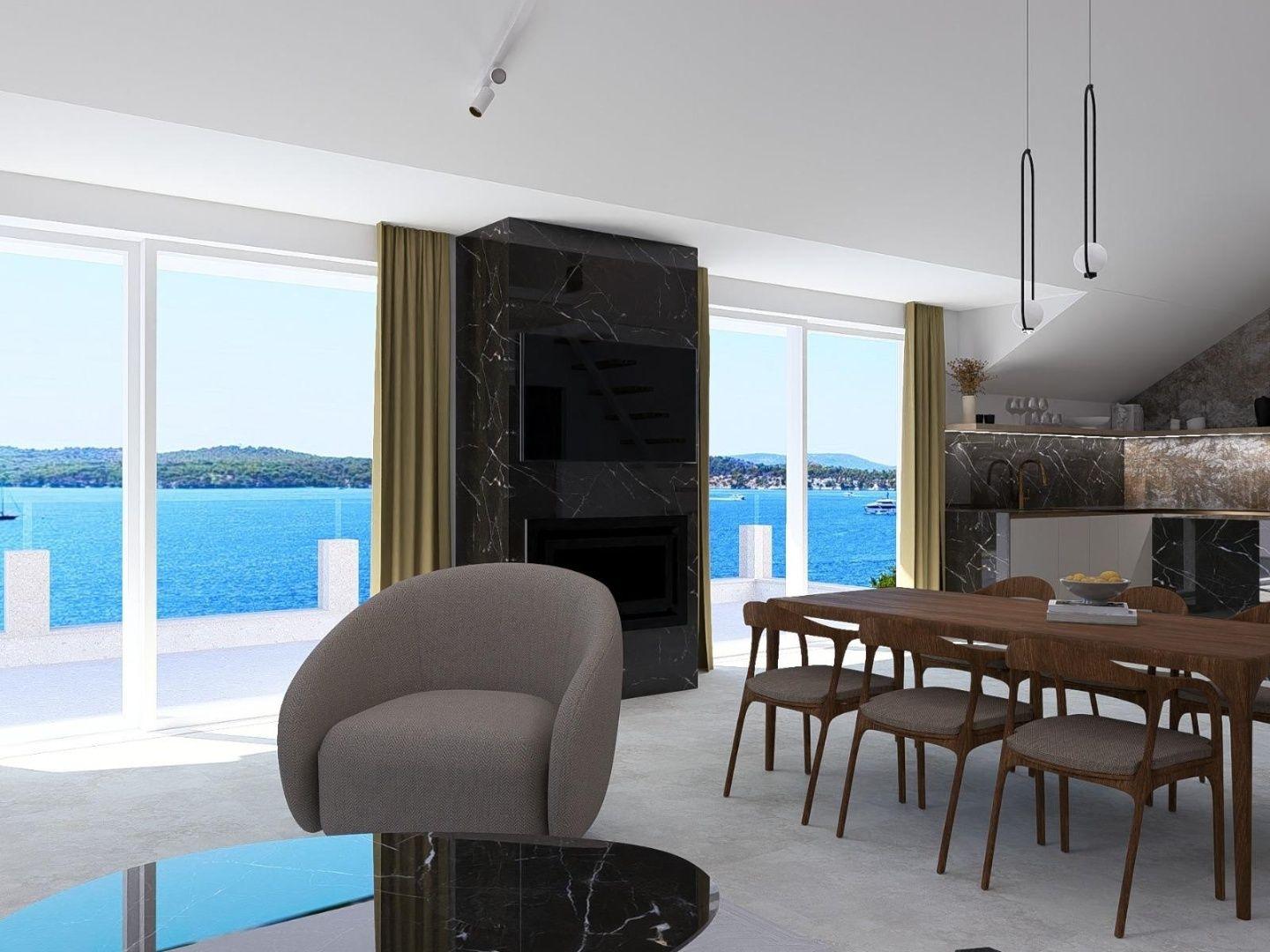 Priestranná obývacia izba spojená s jedálňou a kuchyňou tvorí centrum domova, spolu s 20 m² veľkou terasou, ktorá ponúka výhľad na more, mesto a malebný kanál sv. Ante.