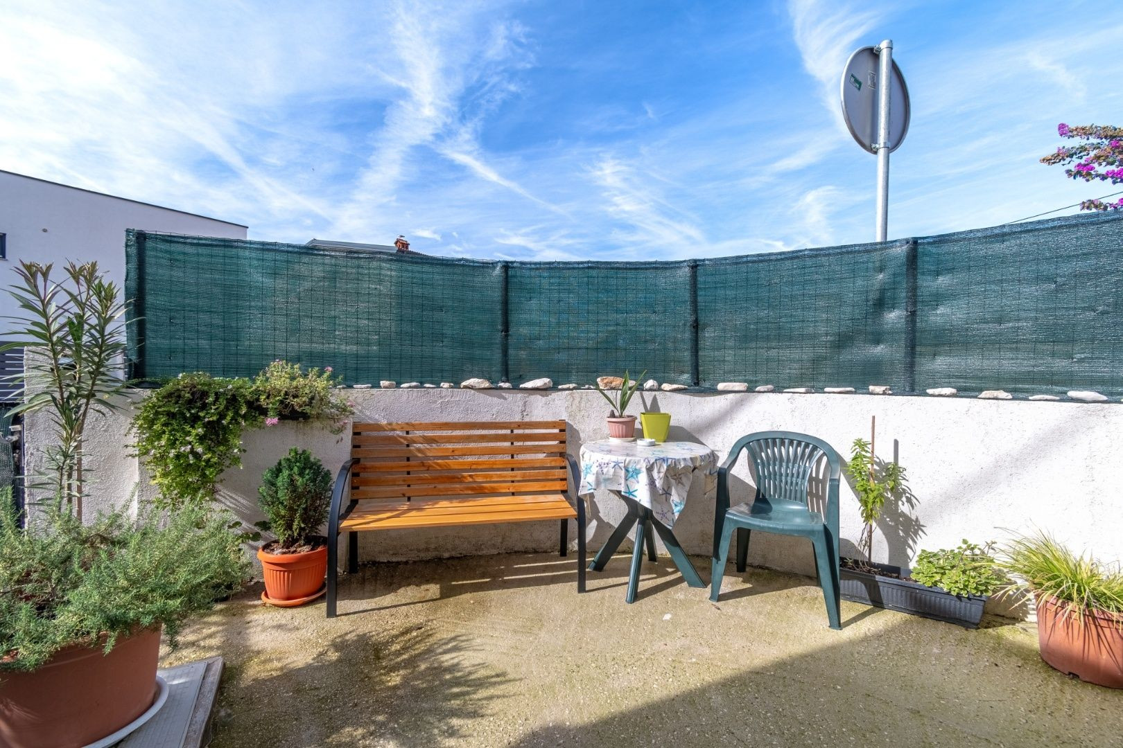 Dom má pripojenie na elektrinu, vodu, telefón/internet a vlastný septik. Dvor s rozlohou približne 20 m² je oplotený, betónový a osadený rastlinami, čo vytvára príjemný priestor na oddych. Nábytok zostáva čiastočne podľa dohody s predávajúcim. Parkovanie je verejné, nachádza sa pred domom.