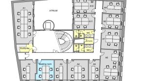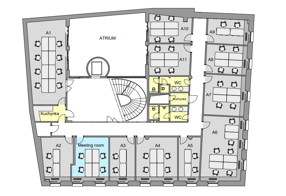 Office A1 (kapacita 8 miest), 57,76m2 vr. podielu. CENA nájmu vr. energií, internetu a DPH = 1.210€/mesiac.