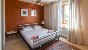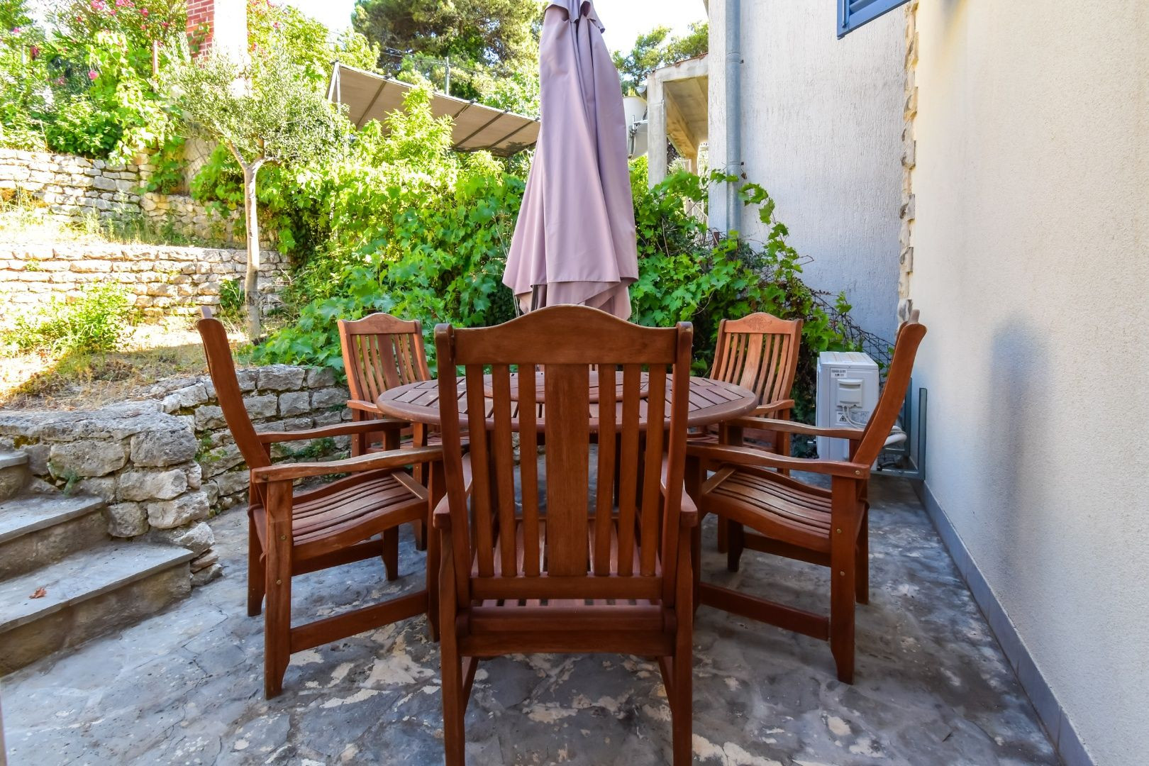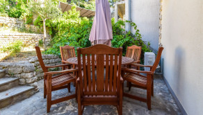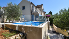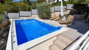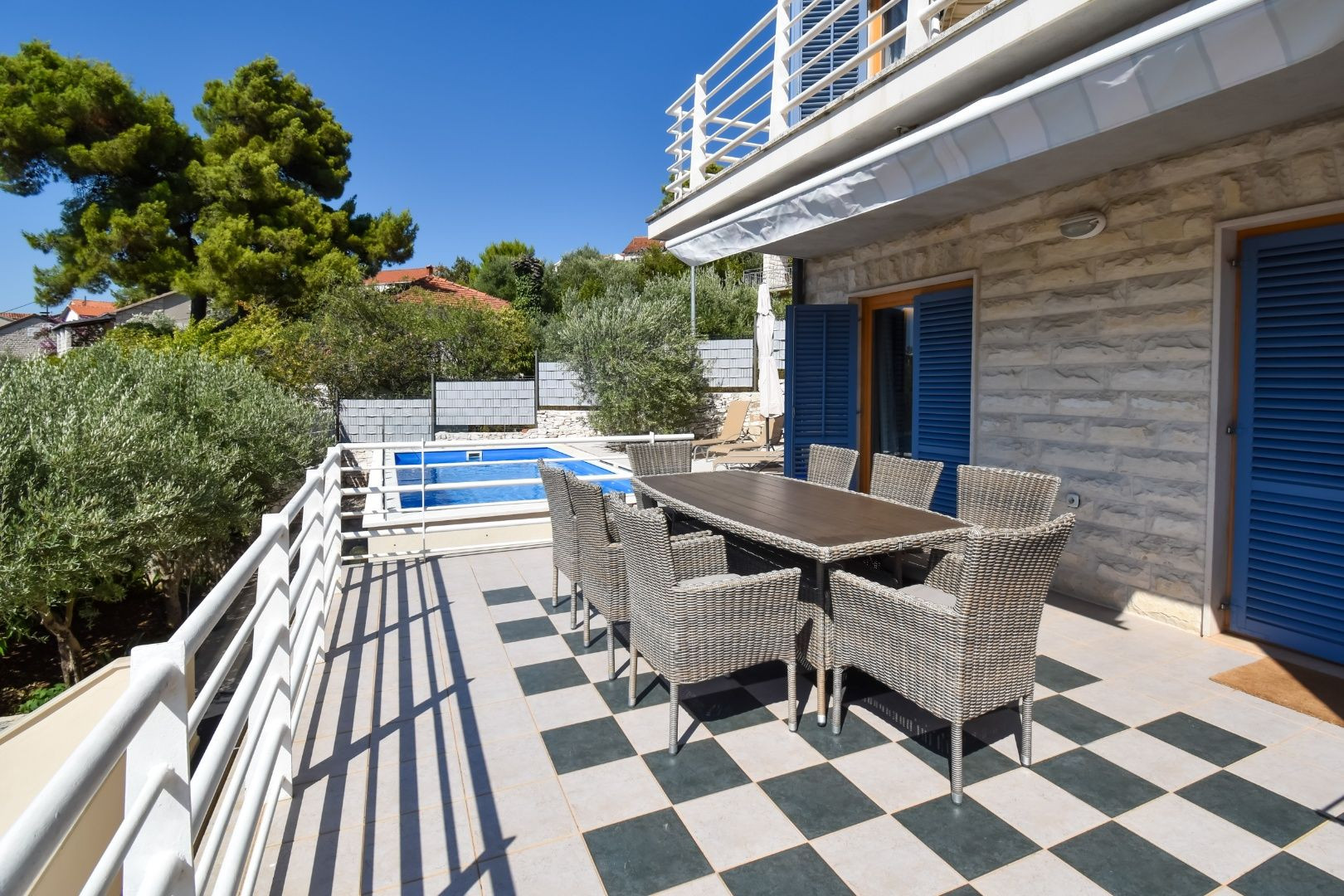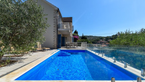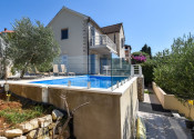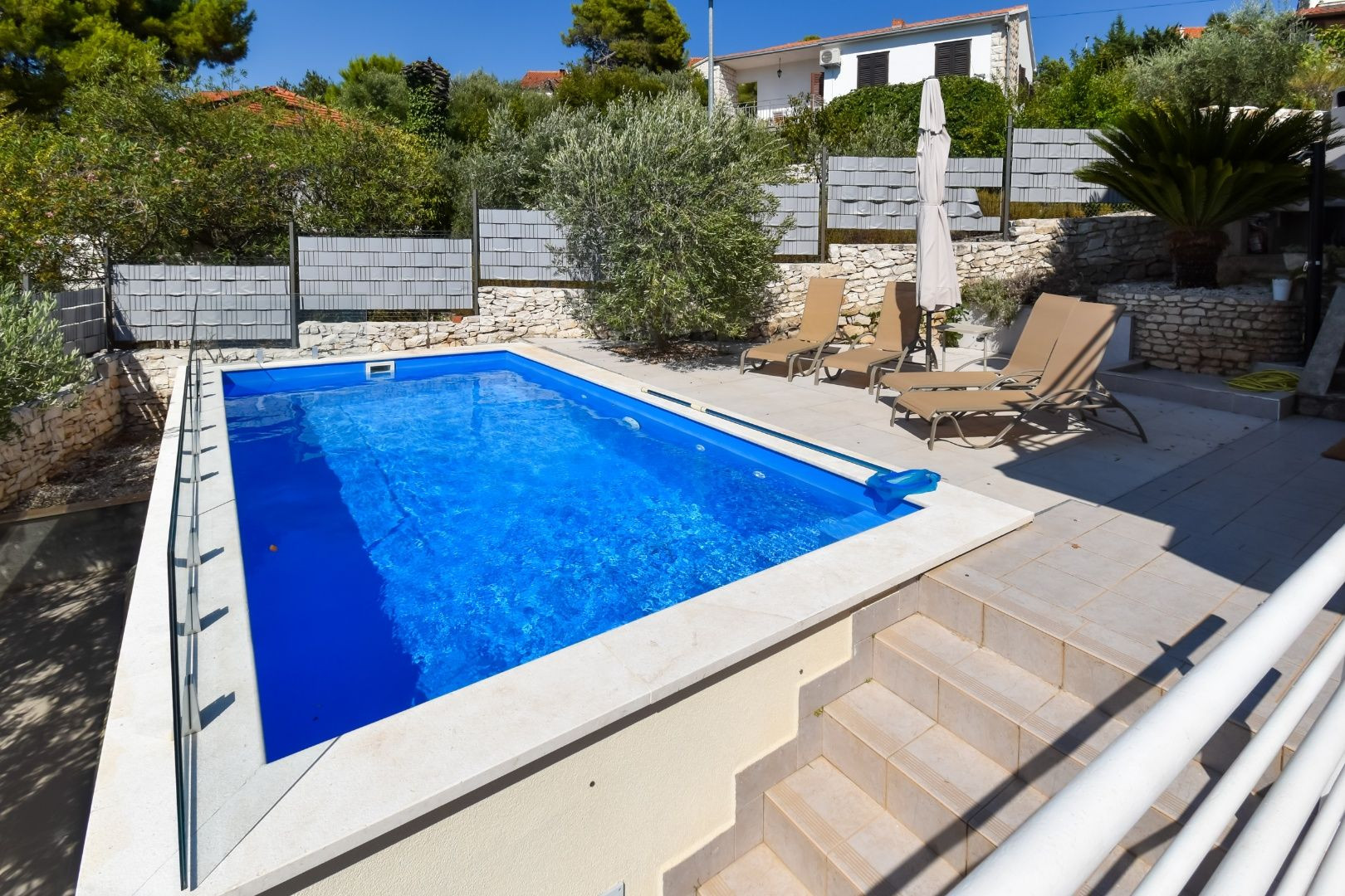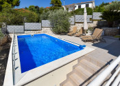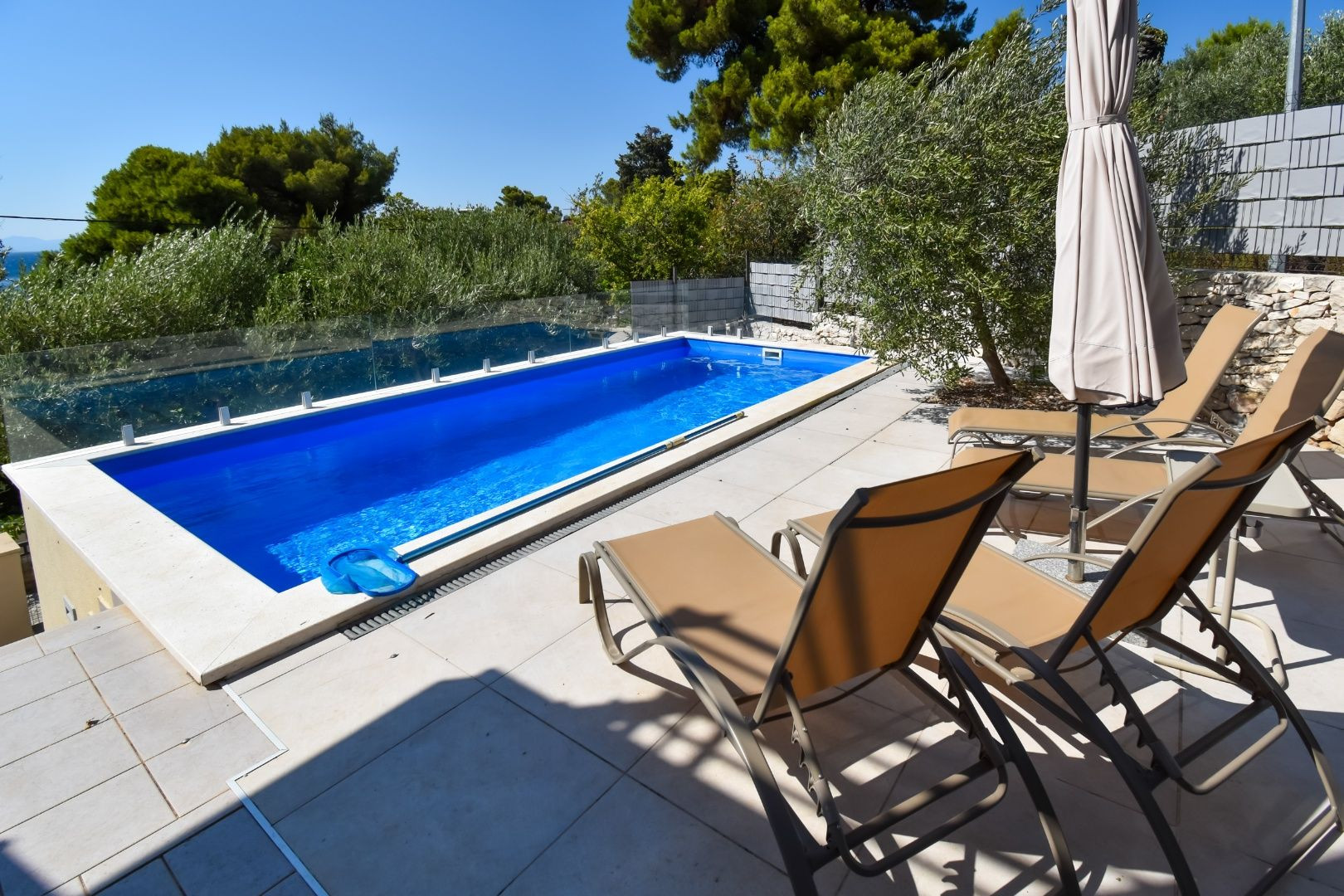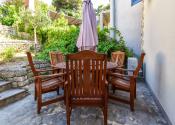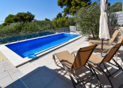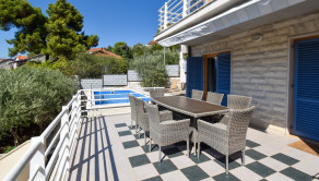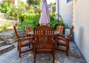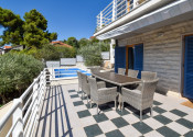Exteriér domu dotvára záhrada s vysadenými stredomorskými rastlinami, citrusmi a olivovníkmi. Nachádza sa tu aj veľký bazén so slnečnou terasou a vonkajšou sprchou. V zadnej časti domu je gril a ďalšia terasa, ktorá poskytuje príjemný tieň počas horúcich dní.