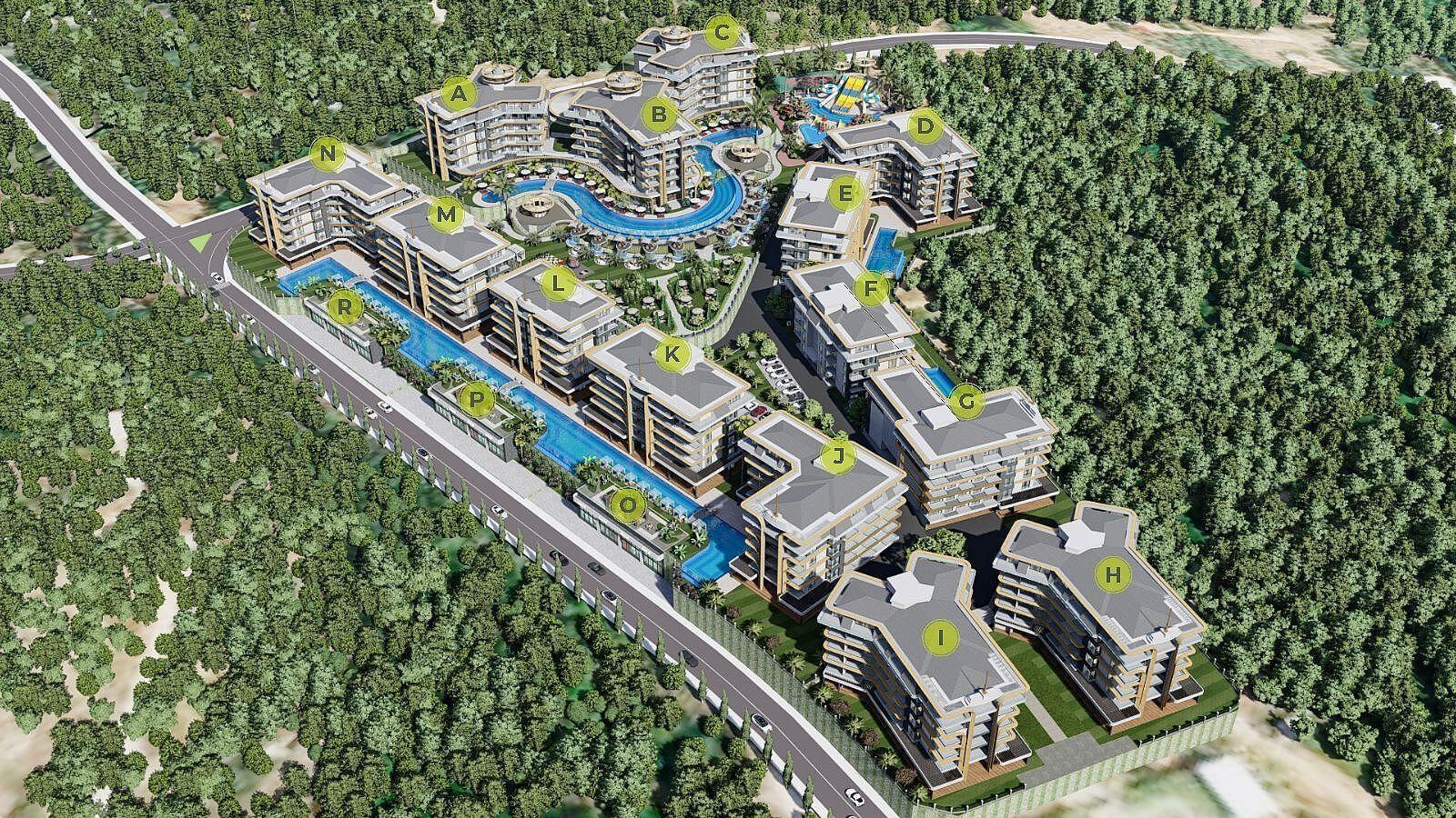 Novopostavené nehnuteľnosti sú súčasťou projektu, ktorý pozostáva zo 14 blokov rozprestierajúcich sa na celkovej ploche 35 109 m². V rámci projektu sú k dispozícii vnútorné a vonkajšie nekonečné bazény, vodné šmykľavky pre deti aj dospelých, vodopády, turistické chodníky, basketbalové a volejbalové ihriská, stolný tenis, tenisový kurt, vybavenie na vodné pólo, detské ihriská, oddychové zóny, spoločná lobby, recepcia, vyhrievaný vnútorný bazén, turecké kúpele, sauna, parná a soľná miestnosť, masážne miestnosti, hobby miestnosti pre dospelých a detský park.