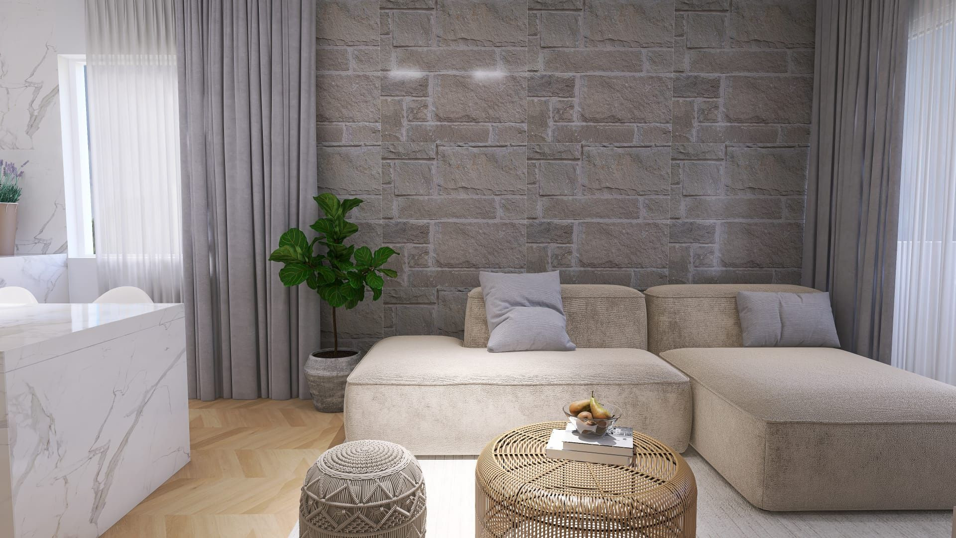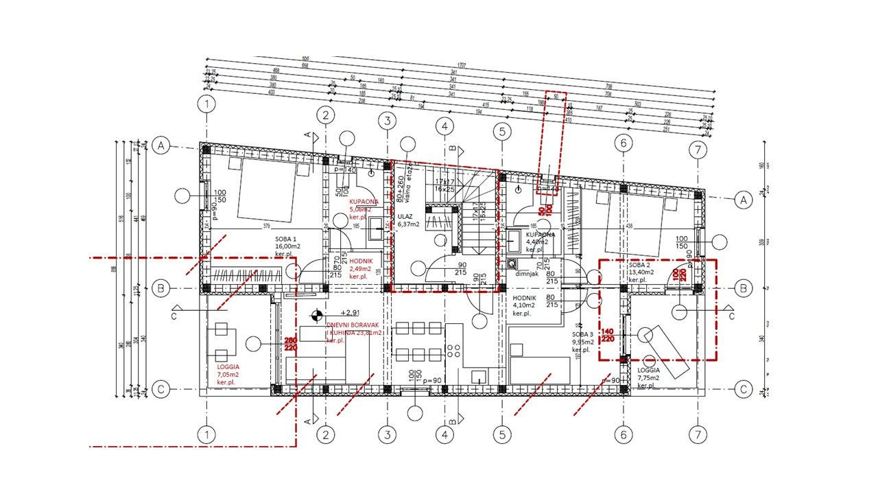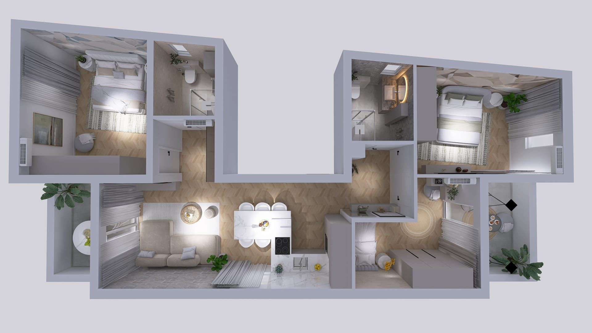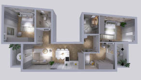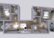 92 m² úžitkovej plochy (vstupná chodba, tri spálne, dve kúpeľne, obývačka s jedálňou a kuchyňou)