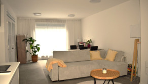 Priestor má 46m2 a predáva sa zariadený. Nová kuchynská linka ikea, zabudovaná chladnička, kvalitné elektrospotrebiče značky Miele (rúra, mikrovlnka, umývačka riadu), práčka, jedálenský stôl, rozkladacia sedačka. Zariadená miestnosť – posteľ, vstavaná skriňa na mieru s led podsvietením. Na oknách sú hliníkové rolety na diaľkove ovládanie. Nové zárubne a kvalitné bezfalcové dvere.