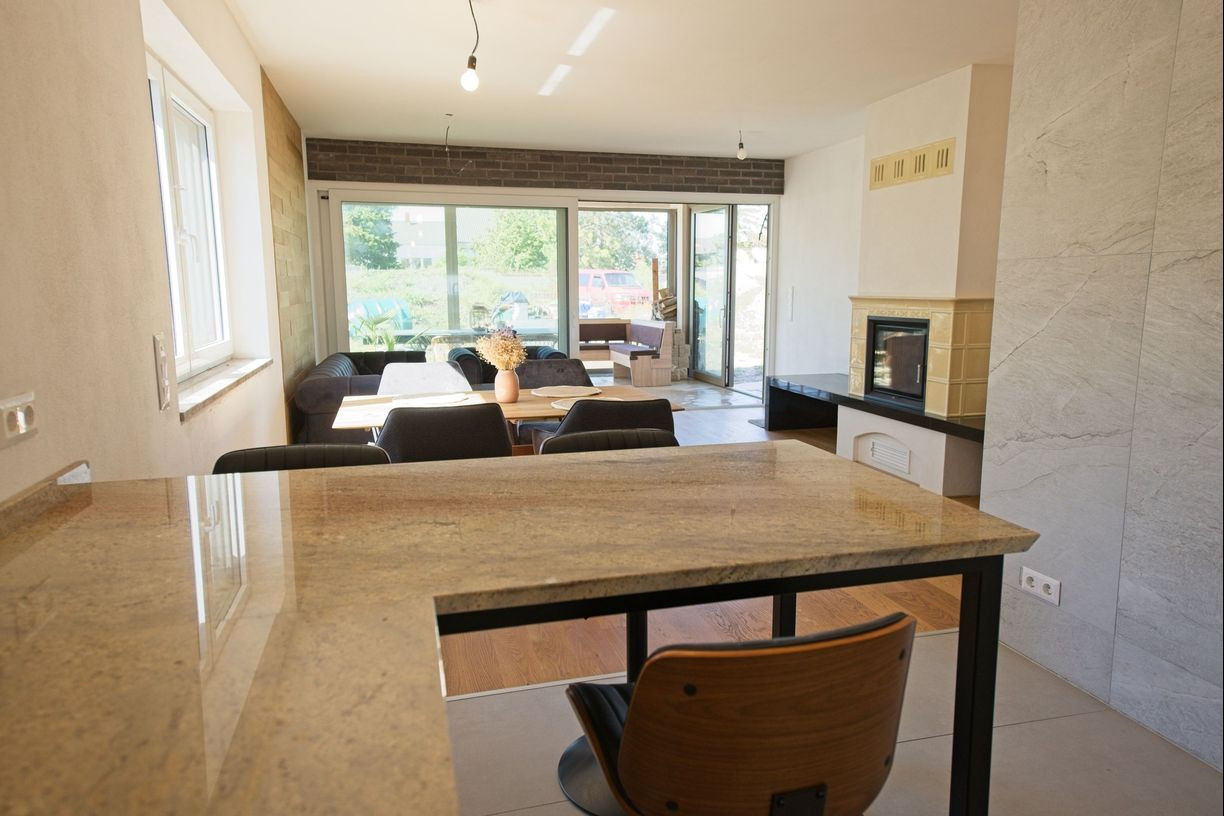 - Fasáda: Kombinácia travertín, klinker a silikátovo-silikónová omietka (Baumit – umývateľná a nespinivá)