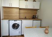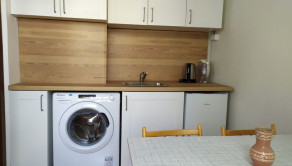- kuchyňa s jedálenským stolom, stoličkami a novou kuchynskou linkou so zabudovanými spotrebičmi - práčka a chladnička. Súčasťou je aj základné kuchynské vybavenie