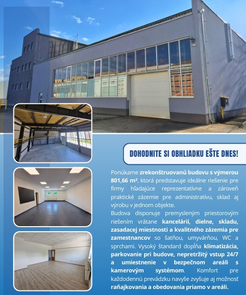 Prevádzkovo – administratívna budova vo výmere 801,66m2 na prenájom