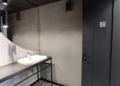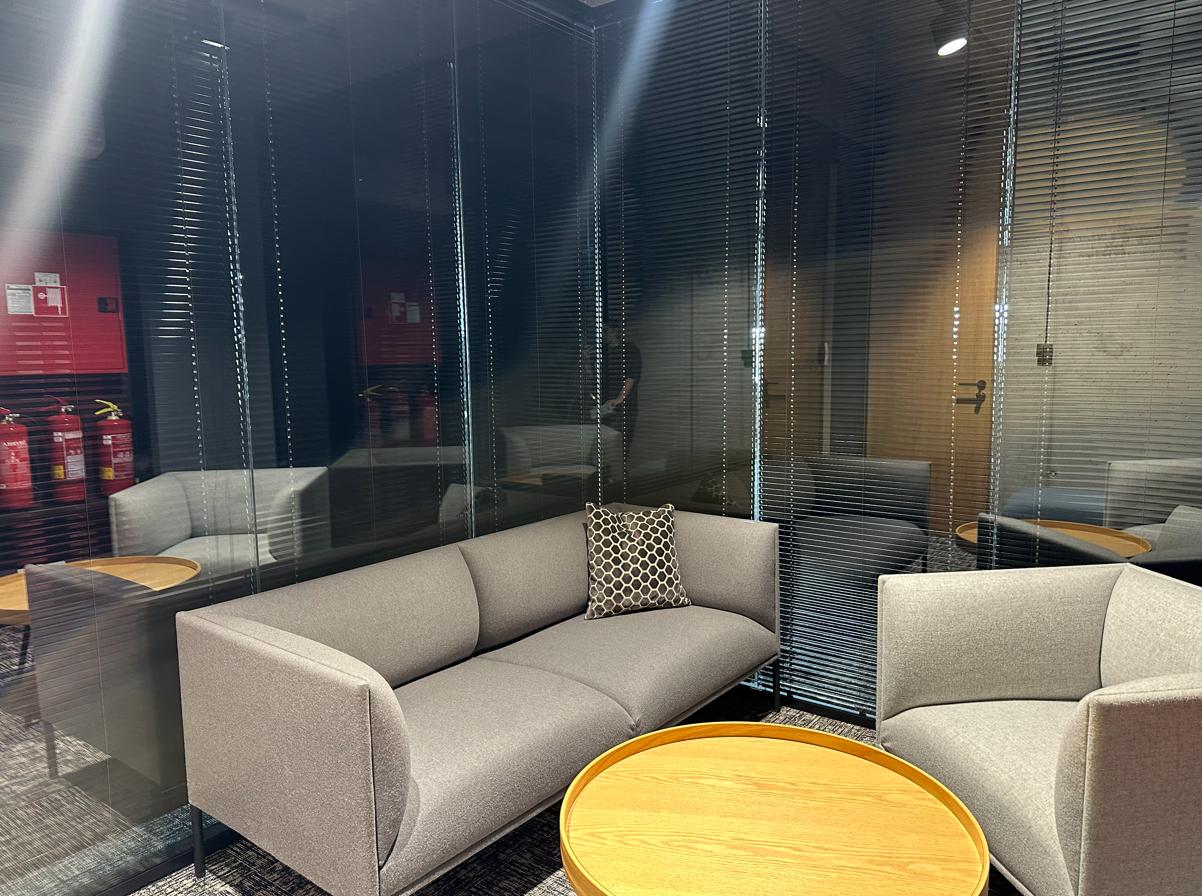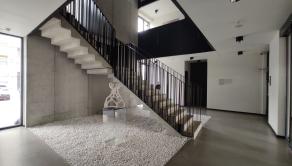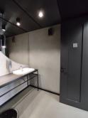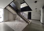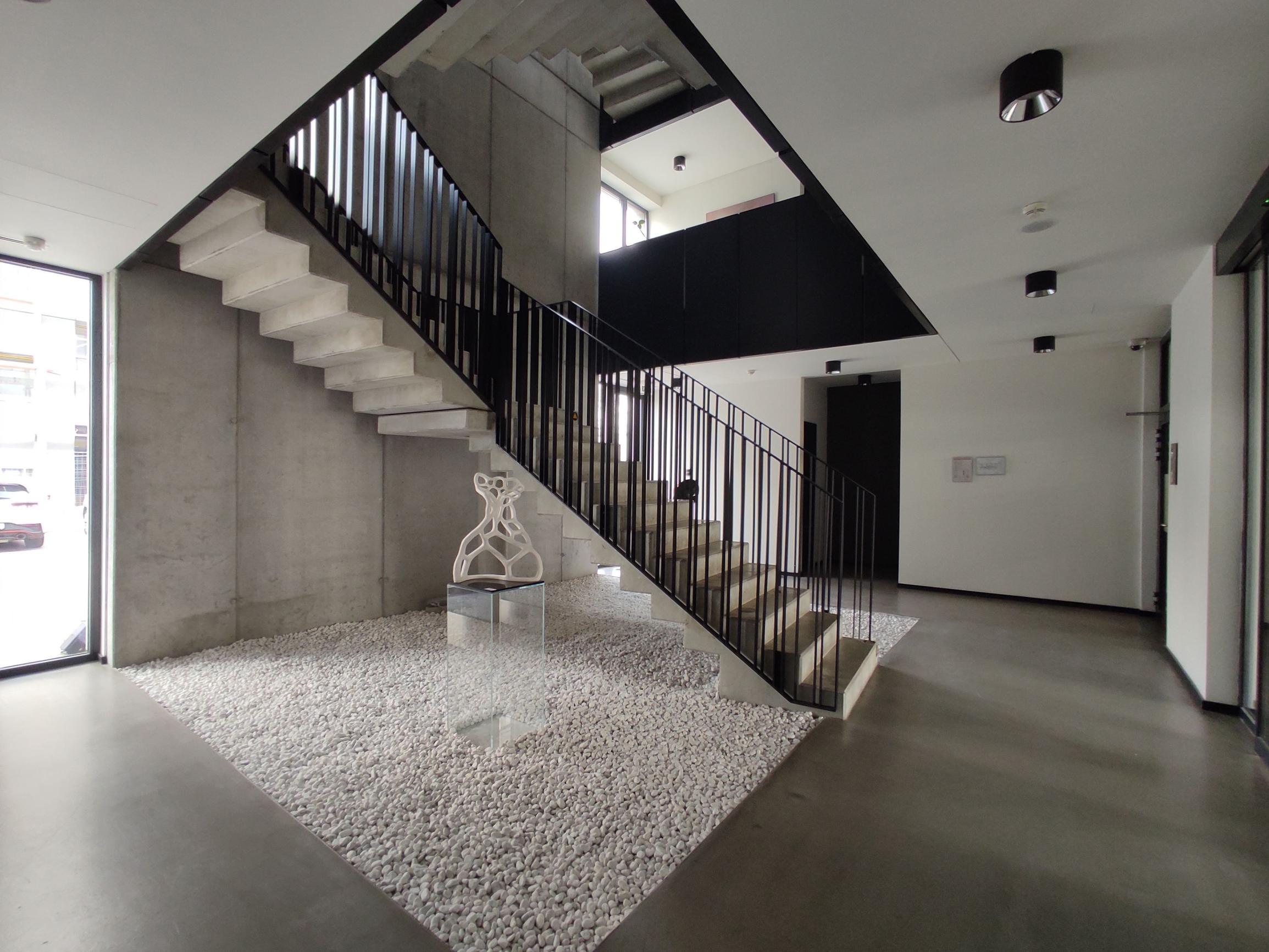 Administratívny celok sa dispozične delí na svetlý open-space so vstupom na rozsiahlu 116m2 terasu, veľkú presklenú zasadačku, menšiu zasadaciu miestnosť/kanceláriu, kuchynku s posedením, chodbu s úložným priestorom a kúpeľňu so sprchovým kútom.