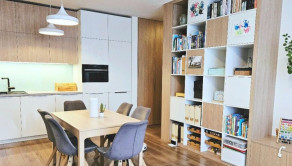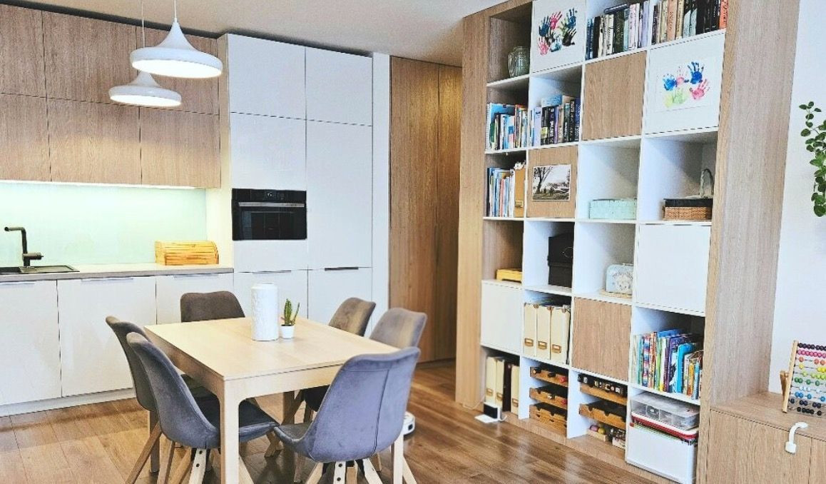 Byt sa predáva so zariadením vyrobeným na mieru, ktoré poskytuje nadštandardné množstvo úložného priestoru v celom byte.