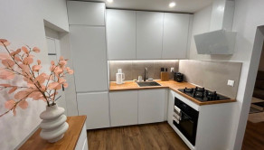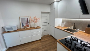 Byt je kompletne zariadený – nové príbory, taniere, umývačka riadu, kávovar, mikrovlnná rúra a ďalšie vybavenie.