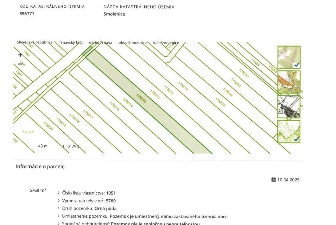 Ponúkame na predaj pozemok – ornú pôdu o rozlohe 5760m2. Pozemok sa nachádza v blízkosti areálu Chemolak v Smoleniciach.