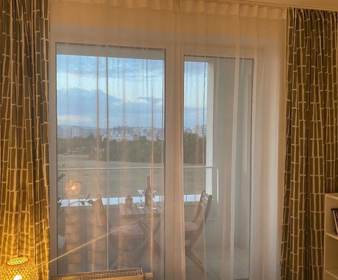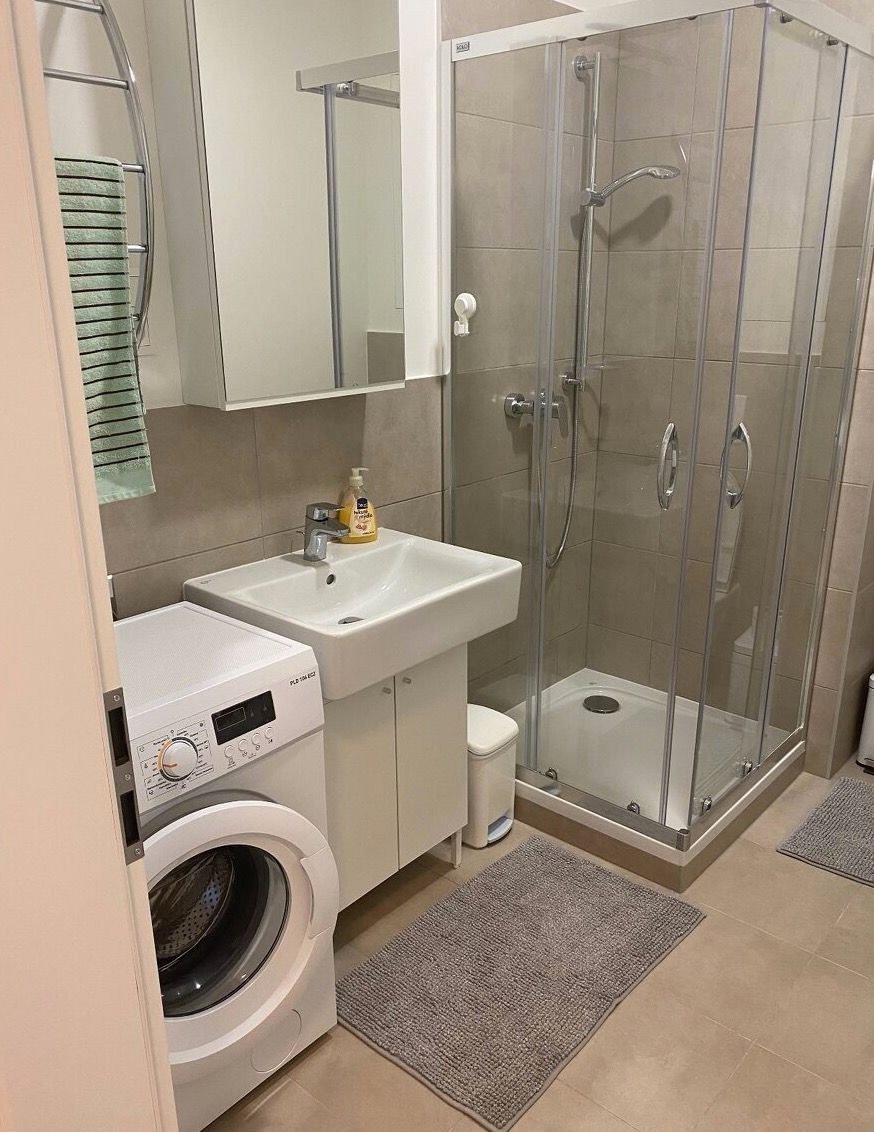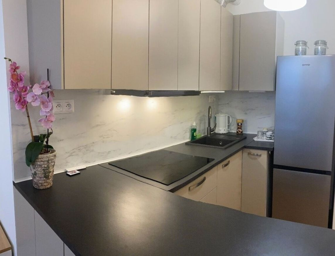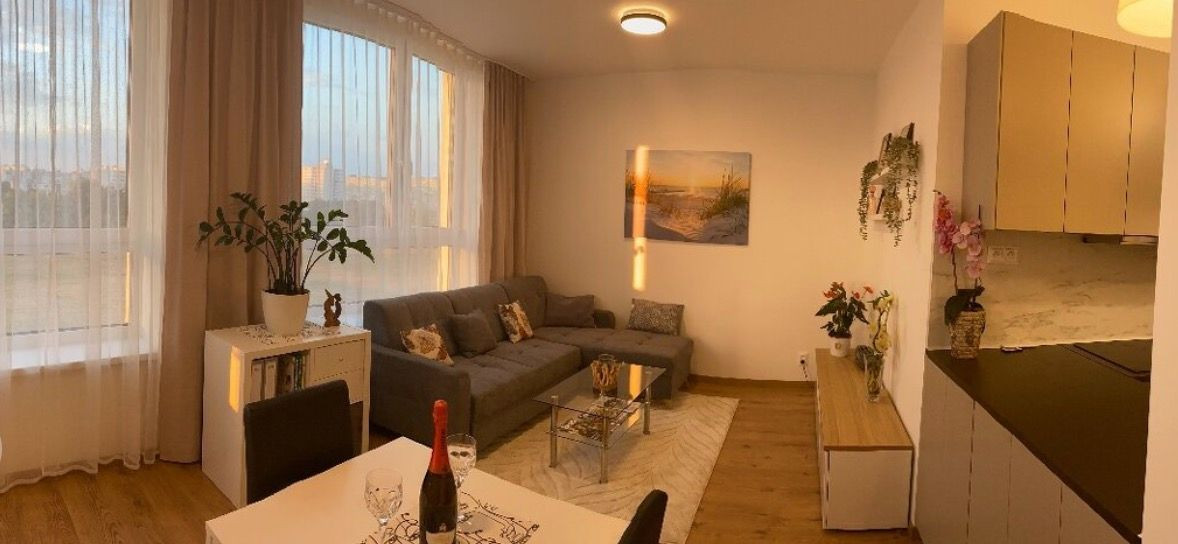 Vybavenie: kuchynská linka, klimatizácia, teplovzdušná rúra, indukčná varná doska, veľká chladnička s mrazničkou. vstavaná skriňa v spálni a v predsieni, dvoj posteľ, rozkladací rohový gauč, automatická pračka