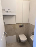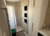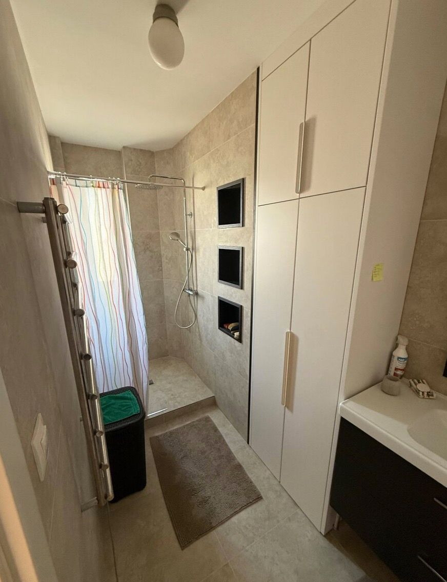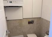 Kúpeľna disponuje walk-in sprchovým kútom, umývadlom, radiátorom a skriňou na mieru, ktorá ukrýva práčku a sušičku. Disponuje tiež oknom, ktoré poskytuje jednoduché vetranie.