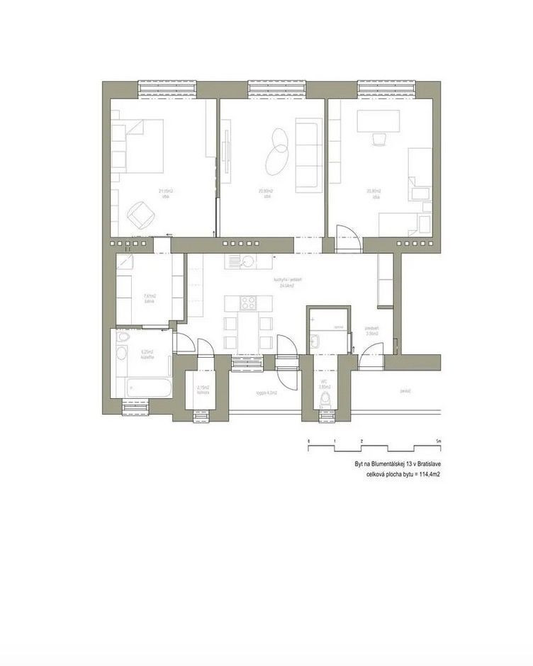 Byt sa nachádza vo vyhľadávanej lokalite, na Blumentálskej ulici. Byt pozostáva z 3 priestranných izieb (á 21 m²), v ktorých su repasované pôvodné parkety; samostatnej kuchyne s jedálenským kútom (24 m²), z ktorej je vstup na lodžiu; chodby so vstavaným šatníkom; dvoch kupeľní s WC; walk-in šatníka a špajzy. Dominantou bytu sú vysoké stropy s výškou 3.36m, ktoré dodávajú bytu vzdušnosť.