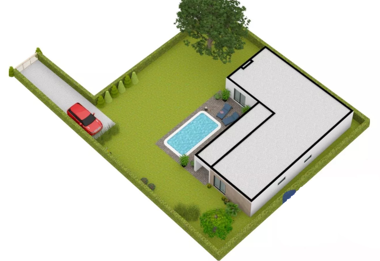 Pozemok je rovinatý, oplotený z troch strán a má samostatný prístup po spevnenej ceste. Orientácia na juh a západ zabezpečuje dostatok denného svetla počas celého dňa – perfektné pre budúcu terasu, záhradu či bazén.