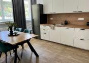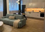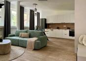 Otvorená denná časť s kuchyňou a jedálenským stolom dýcha vzdušnosťou, spálňa ponúka pokojný úkryt od mesta a kúpeľňa je riešená elegantne a funkčne.