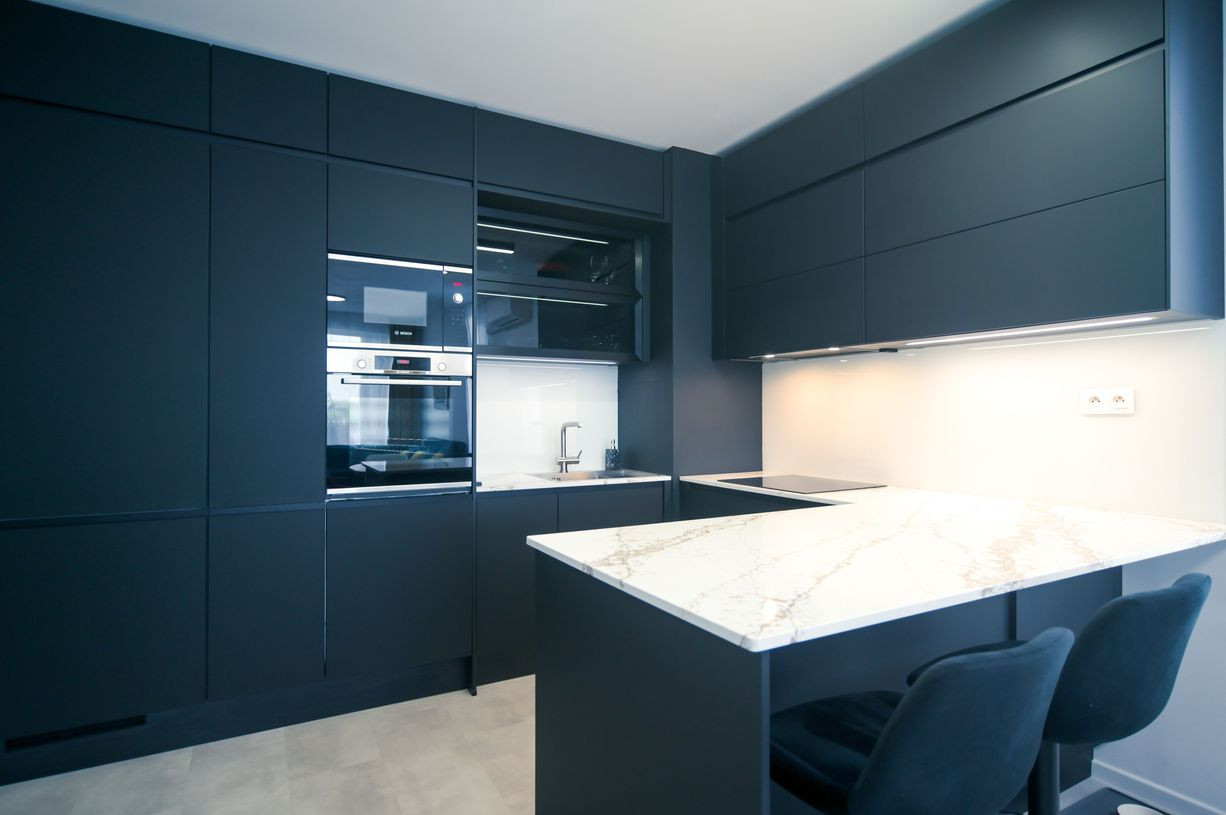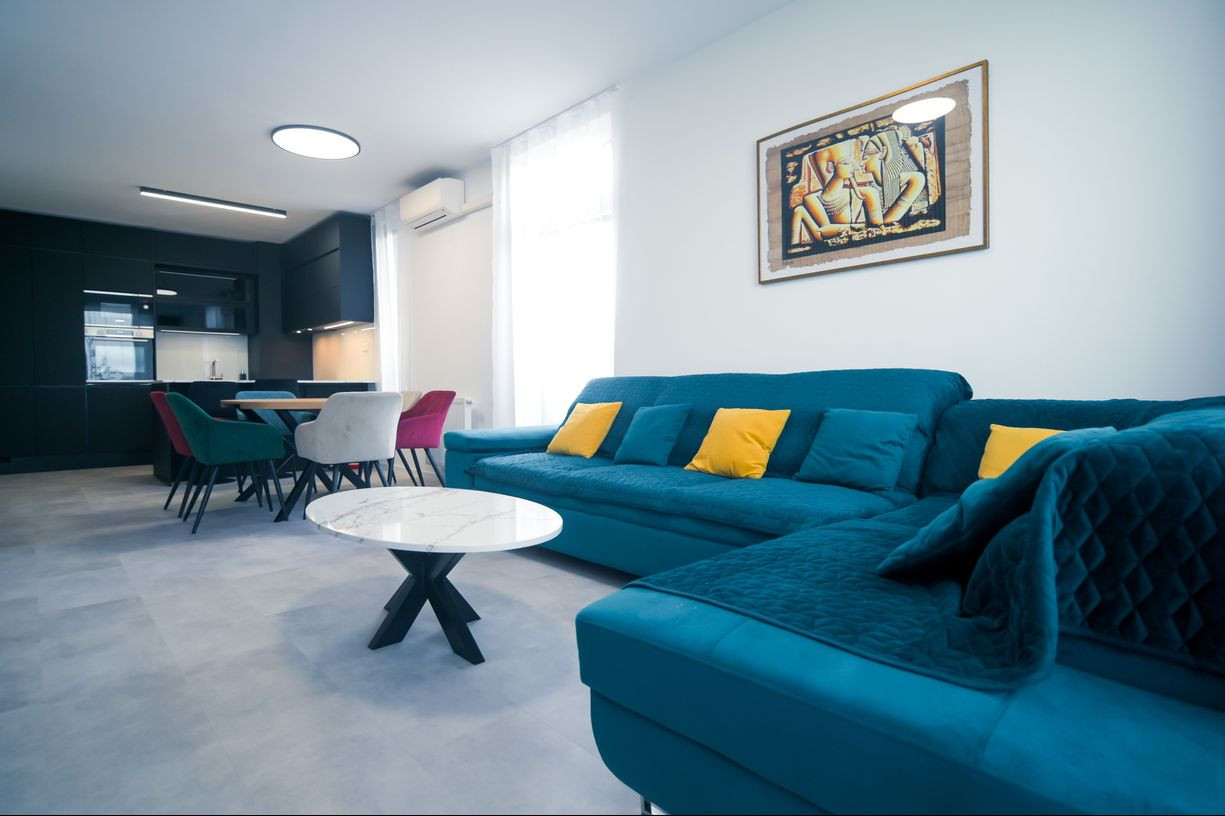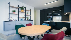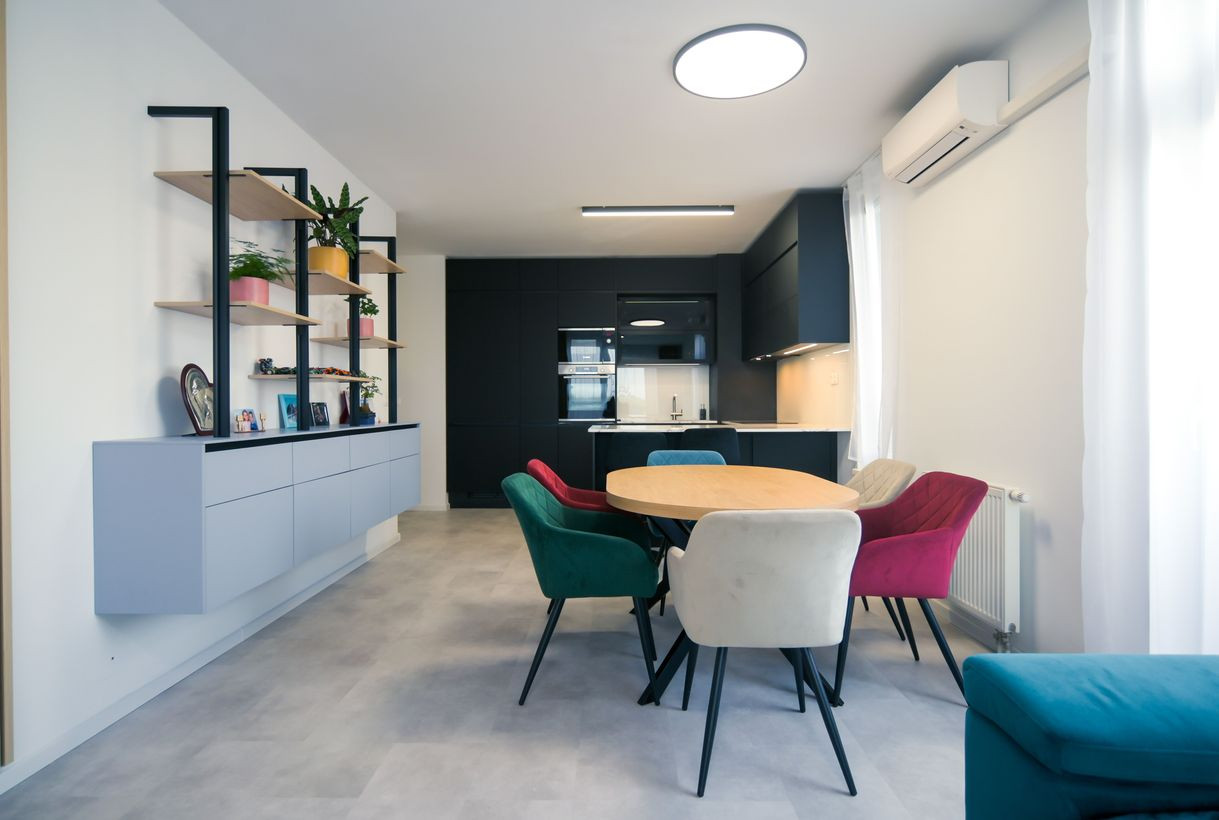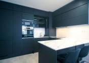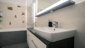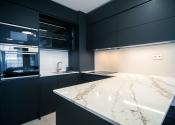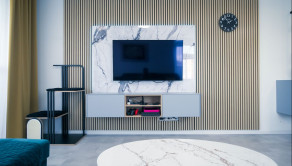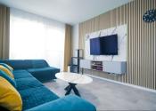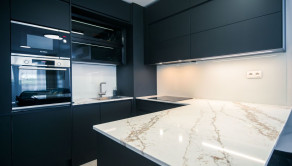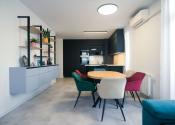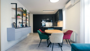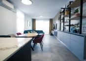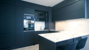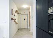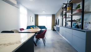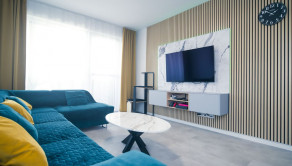 Byt prešiel rozsiahlym redizajnom obývacej izby, kuchyne, botníka a podláh. Pri úpravách boli použité prémiové materiály nemeckej výroby vrátane kamenných pracovných dosiek.