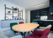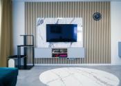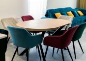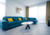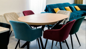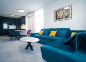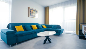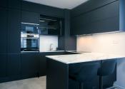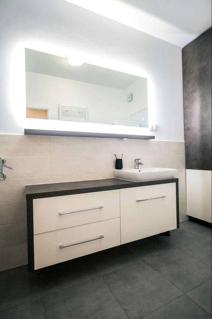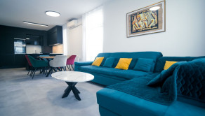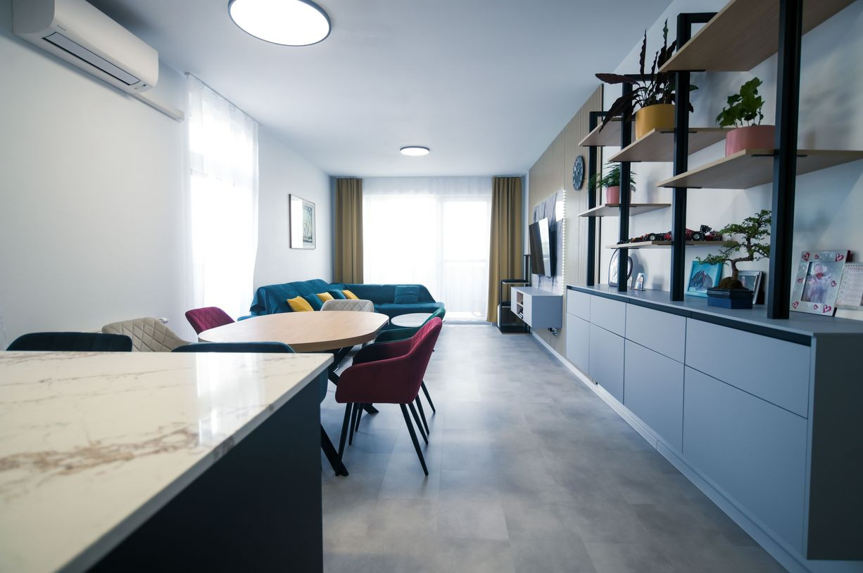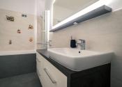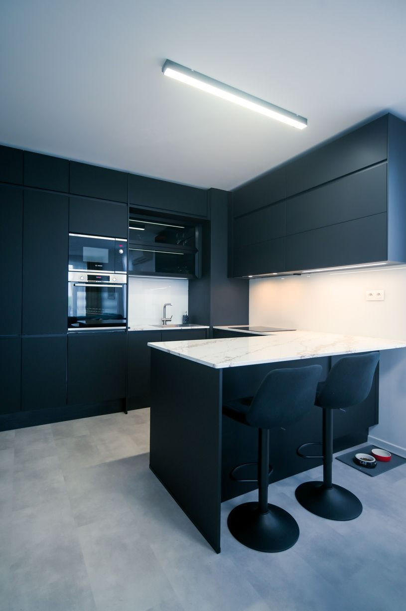 Byt prešiel rozsiahlym redizajnom obývacej izby, kuchyne, botníka a podláh. Pri úpravách boli použité prémiové materiály nemeckej výroby vrátane kamenných pracovných dosiek.