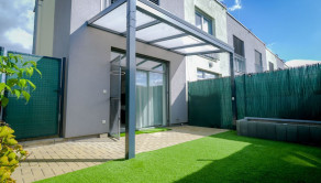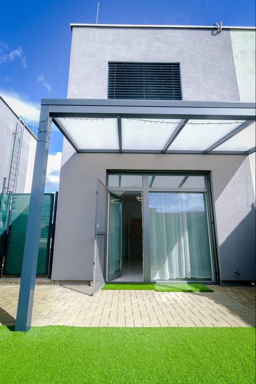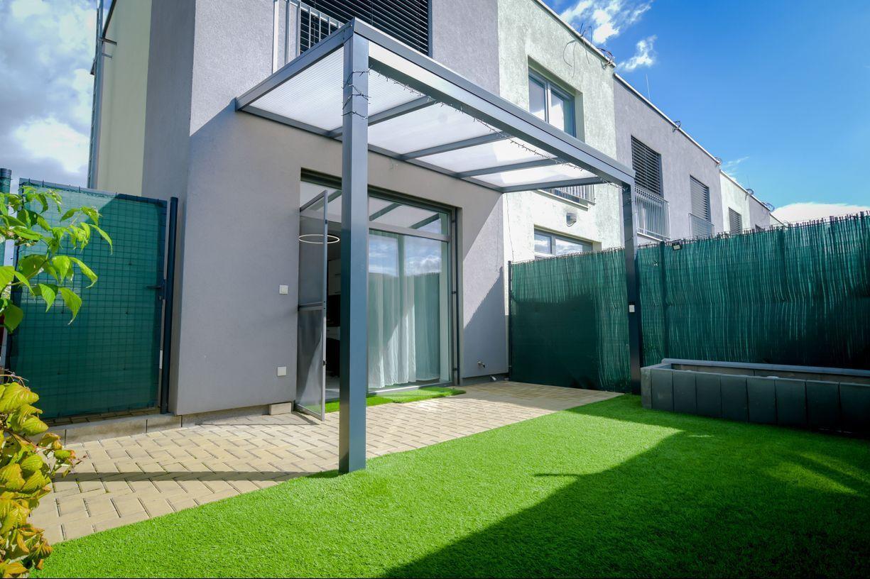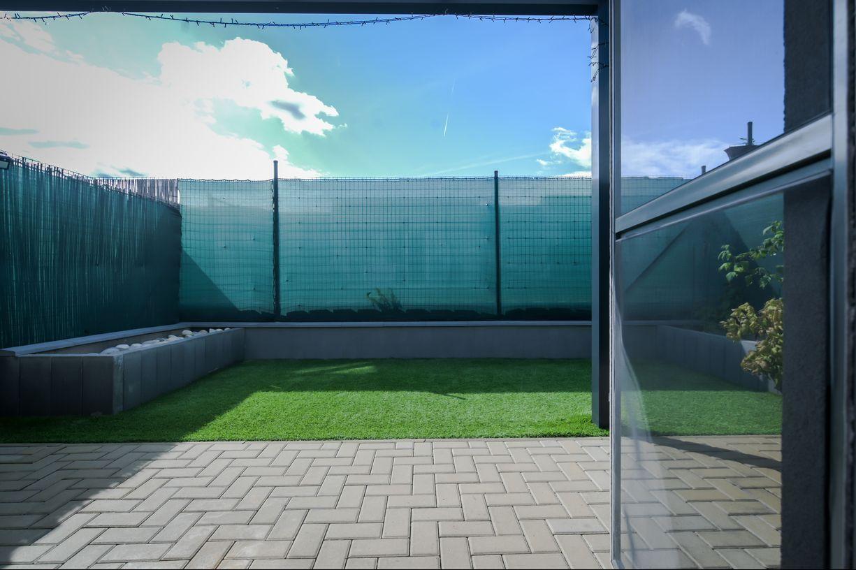väčšia záhrada (27 m²) s bezúdržbovým umelým trávnikom, vyvýšenými záhonmi a zámkovou dlažbou