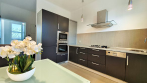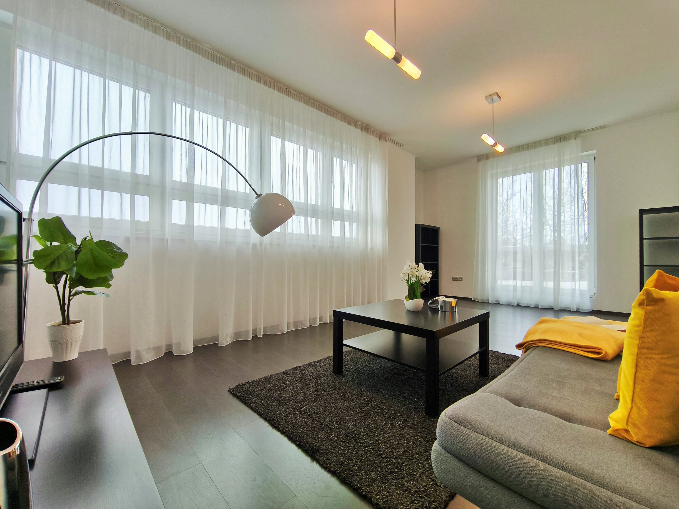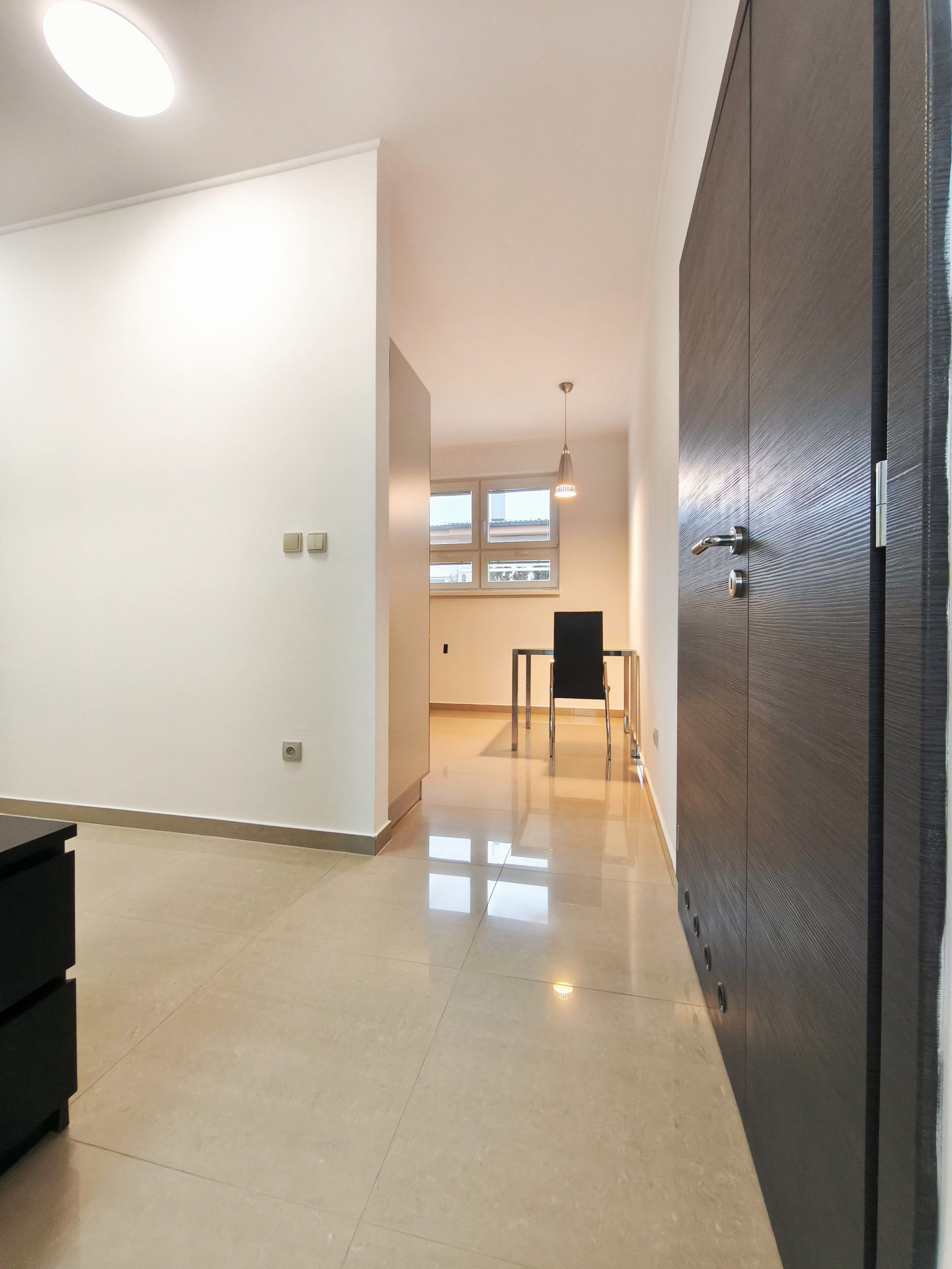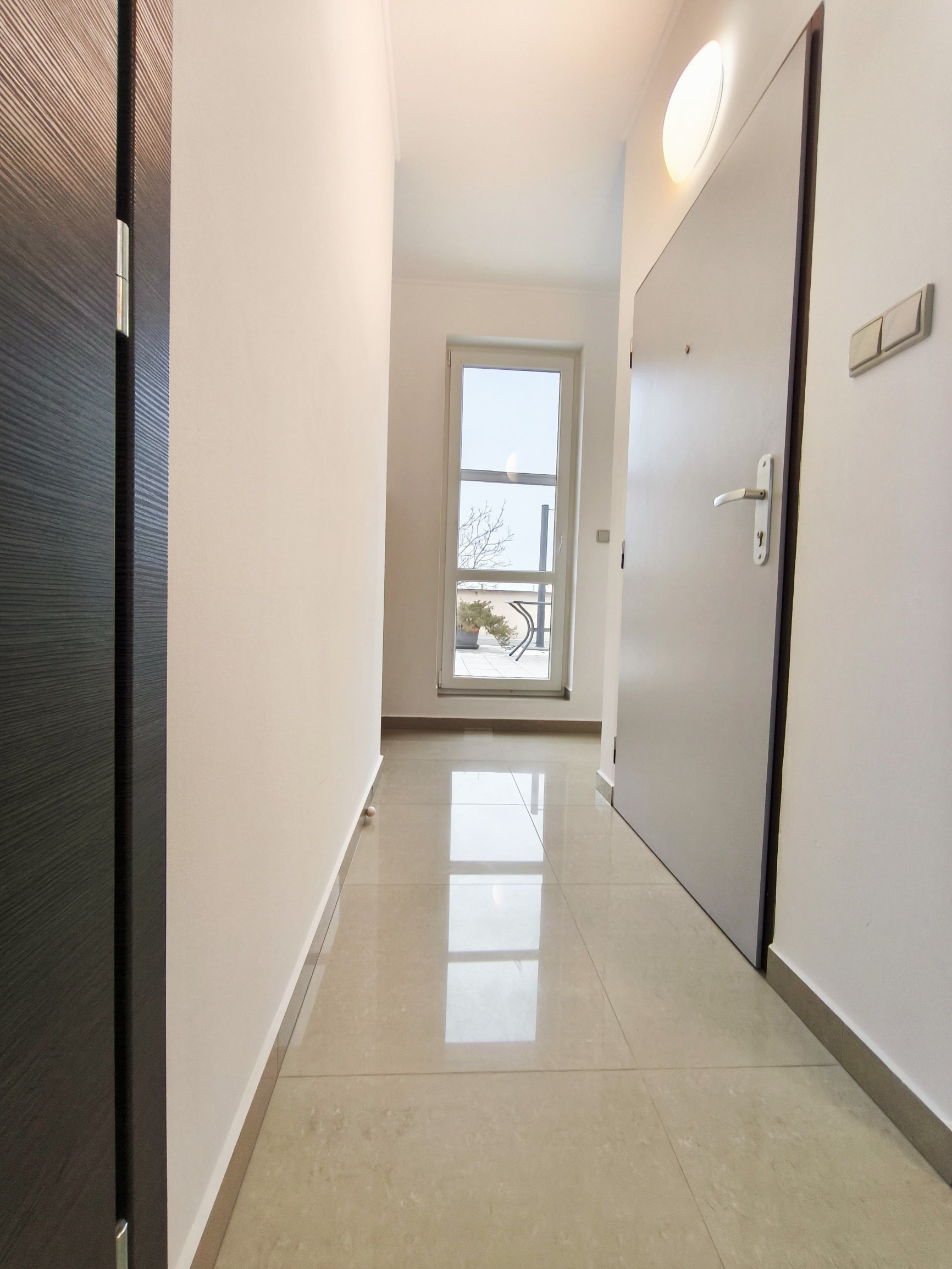 Samotný byt má celkovú výmeru 72 m2, pozostáva z veľkej vstupnej haly, (časť haly vedúcej k dverám na terasu je možné využiť ako šatník / sklad), kúpeľne s toaletou a troch samostatných miestností. Jedna z miestností je zariadená ako samostatná kuchyňa + dve veľké samostatné izby (20 a 23 m2). Byt má veľkú variabilitu – jednoduchými zmenami dispozície je možné byt prerobiť na 3, alebo aj 4 – izbový. Interiér je dokončený stolárom na mieru (KL so spotrebičmi, veľká vstavaná skriňa po celej hale).