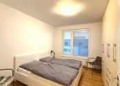 Spálňa je zariadená manželskou posteľou a veľkou vstavanou skriňou na mieru s bohatým úložným priestorom.