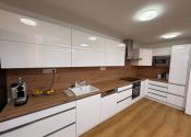indukčná varná doska s 5 zónami, parná rúra, mikrovlnná rúra, umývačka riadu Bosch, chladnička, drvič odpadu, digestor s odťahom a LED osvetlenie.