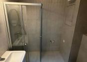 Kúpeľňa so sprchovacím kútom, toaletou a práčkou.