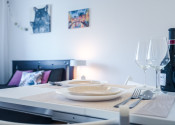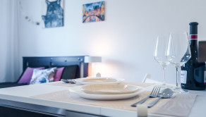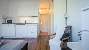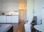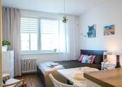 Dispozične pozostáva zo vstupnej chodby, priestrannej izby s kuchynskou linkou a z kúpeľne s vaňou a toaletou. Je zariadený nábytkom aj elektrospotrebičmi vrátane práčky a chladničky. Jeho celková výmera je 19 m2 a nachádza sa v bytovom dome s výťahom na 5./7.p. Byt nemá balkón a neprislúcha k nemu žiadna pivnica.