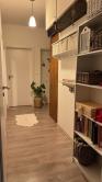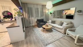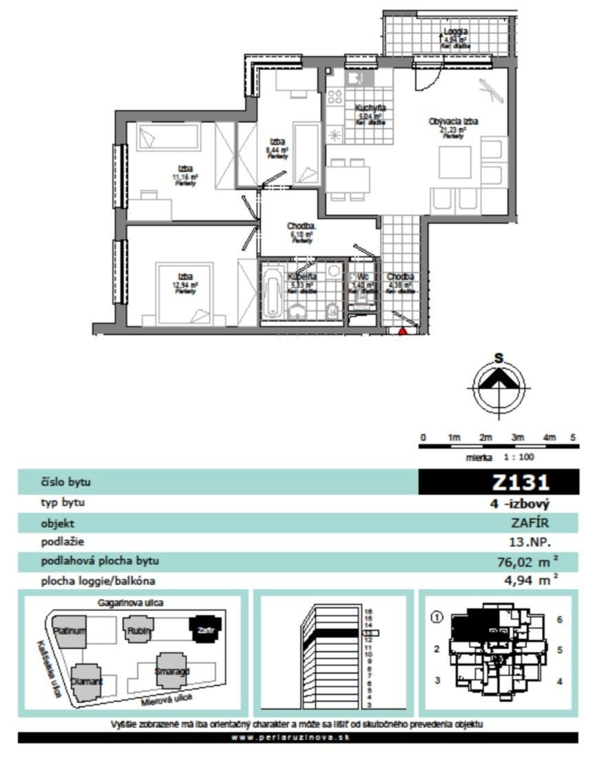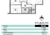 Dispozícia bytu pozostáva zo vstupnej chodby, obývacej izby s kuchyňou a výstupom na balkón. Na ľavej strane od vstupu sa nachádza hosťovská toaleta, väčšia kúpeľňa spojená s toaletou a tri samostatné izby.