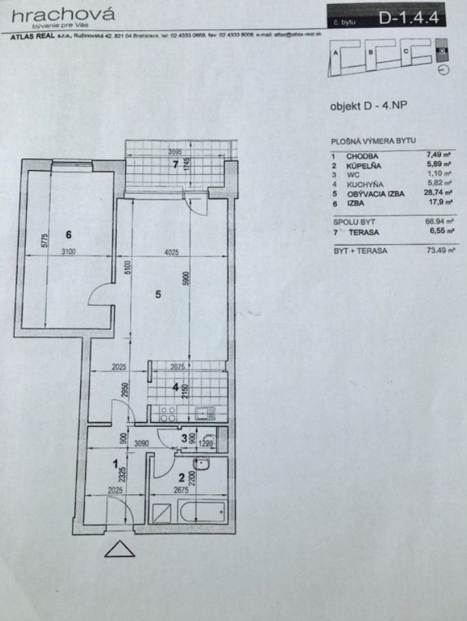 - celková rozloha bytu je 73,5 m2, z toho terasa/balkón 6,5 m2