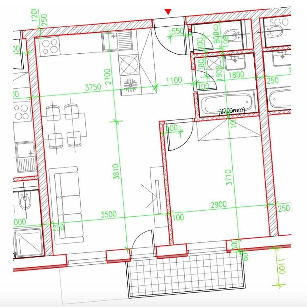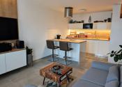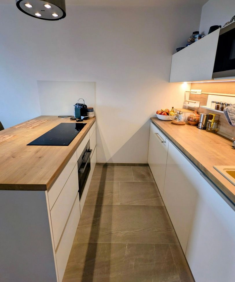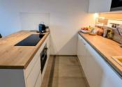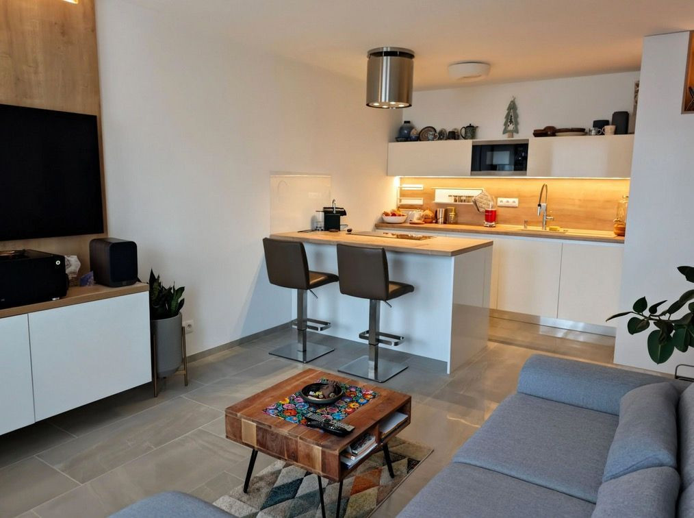Kuchynská linka je vybavená vstavanými spotrebičmi. Indukčná varná doska, elektricky výsuvný digestor, teplovzdušná rúra sa nachádzajú na ostrovčeku s barovým pultom. Chladnička s mrazničkou, práčka a mikrovlnná rúra, sú vstavané v kuchynskej linke spolu s granitovým drezom. Biele povrchy dvierok a zvislých plôch v kuchyni, obývačke a predsieni sú z materiálu Senosan, ktorý je odolnejší voči poškriabaniu alebo chemikáliám.