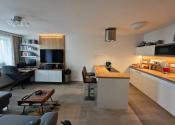 V obývačke sa nachádza kancelársky stôl s kreslom, ktorý nadväzuje na TV skrinku s barom, nad ktorou sa nachádza OLED TV LG 55 osadená priamo na obývačkovej stene v drevenom dekore. Pri protiľahlej stene sa nachádza veľká rozkladacia dvoj-lôžková sedačka s úložným priestorom a s konferenčným stolíkom. Z obývacej izby je prístup na balkón s výhľadom do Mlynskej doliny a Slávičieho údolia.