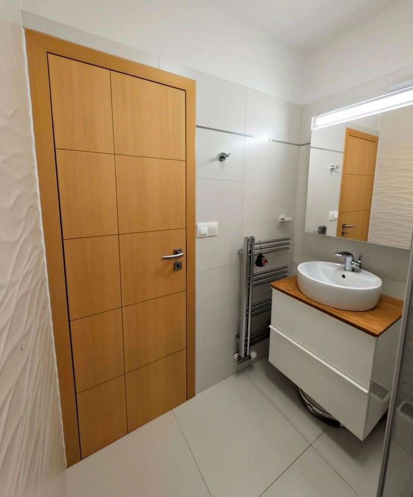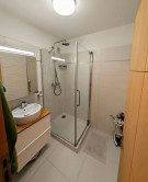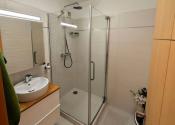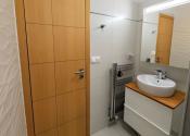 V kúpeľni sa nachádza rebríkový radiátor, skrinka so zrkadlom, umývadlo osadené na dvojpodlažnej skrinke a sprchový kút s termostatickou batériou. Pod skrinkou má miesto robotický vysávač. V kúpeľni je podlahové vykurovanie (zdieľaný okruh kúrenia s rebríkovým radiátorom).