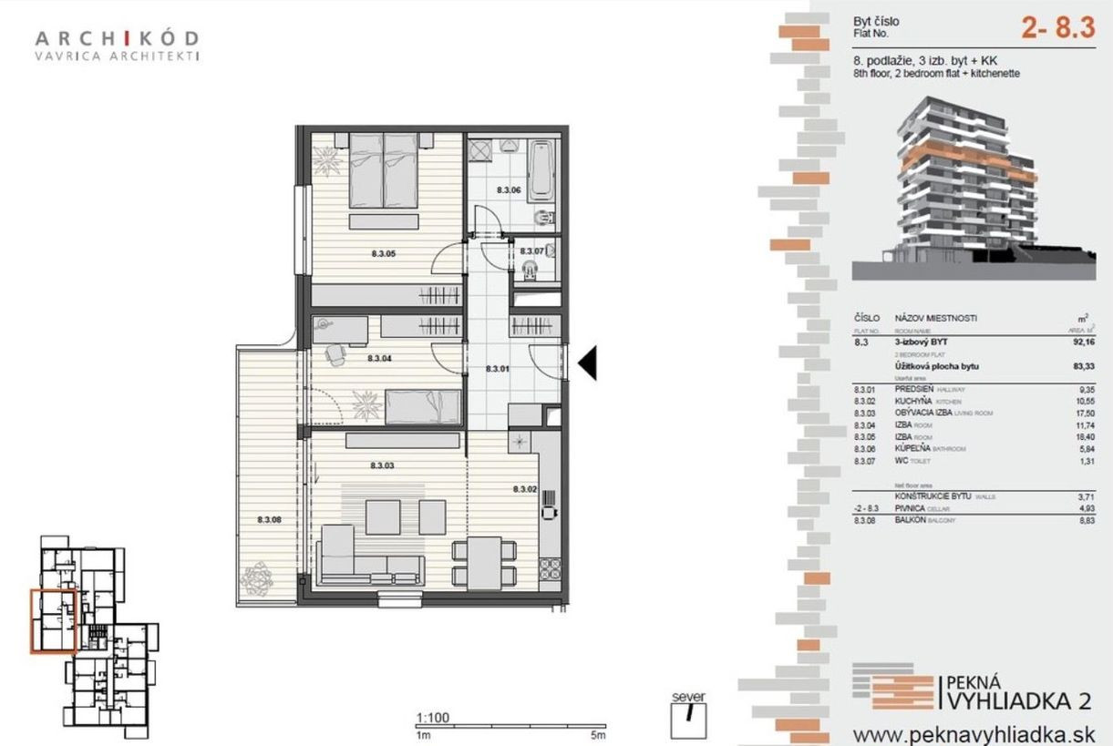 74,69 m² (byt) + 8,83 m² (balkón) + 4,93 m² (pivnica)