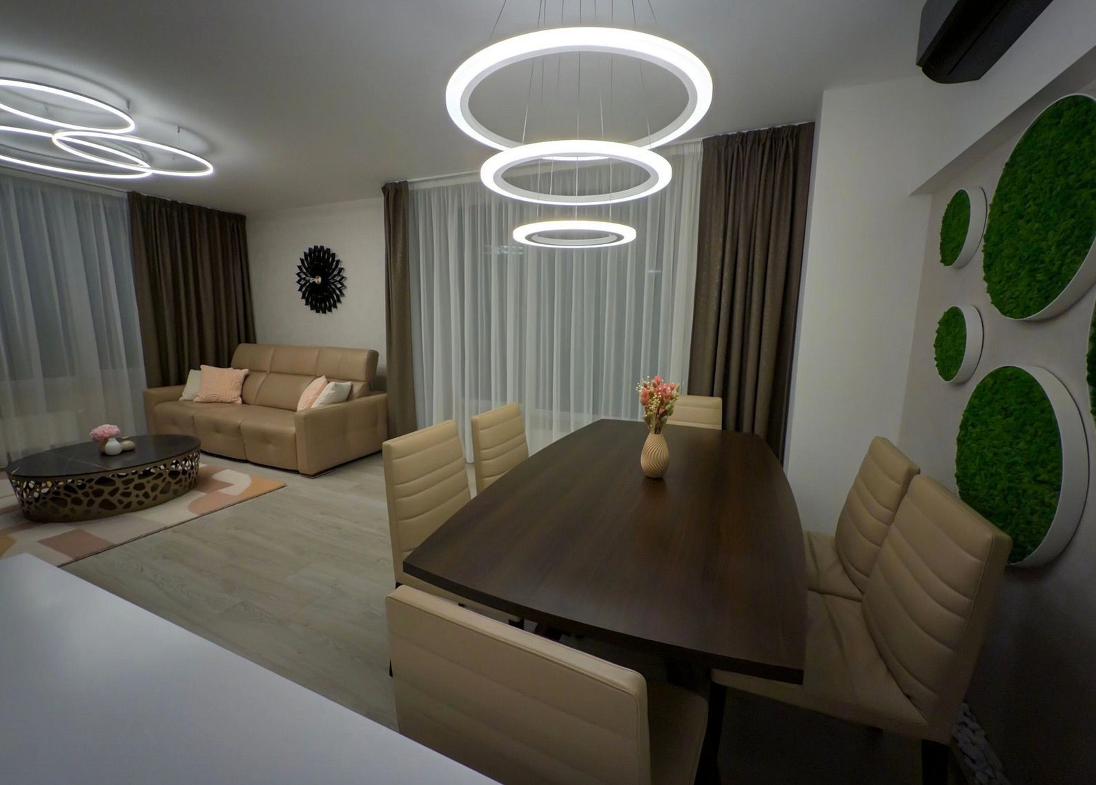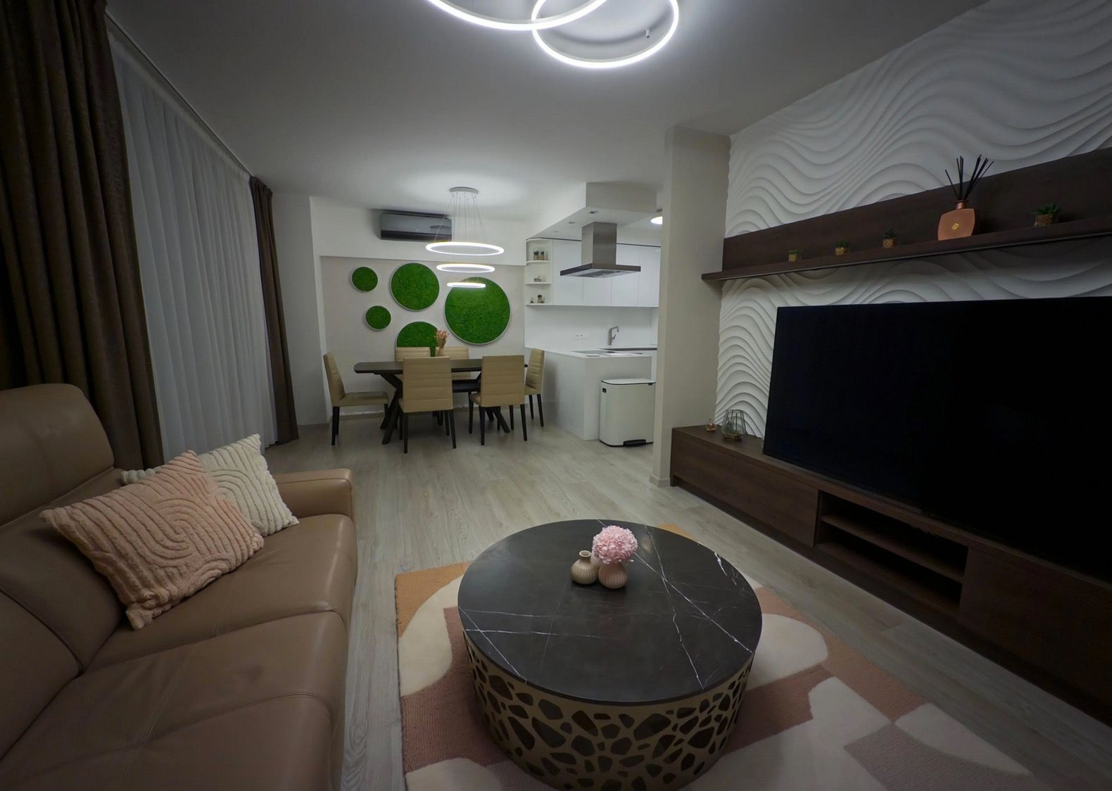 Obývacia izba s luxusnou koženou sedačkou a OLED TV.