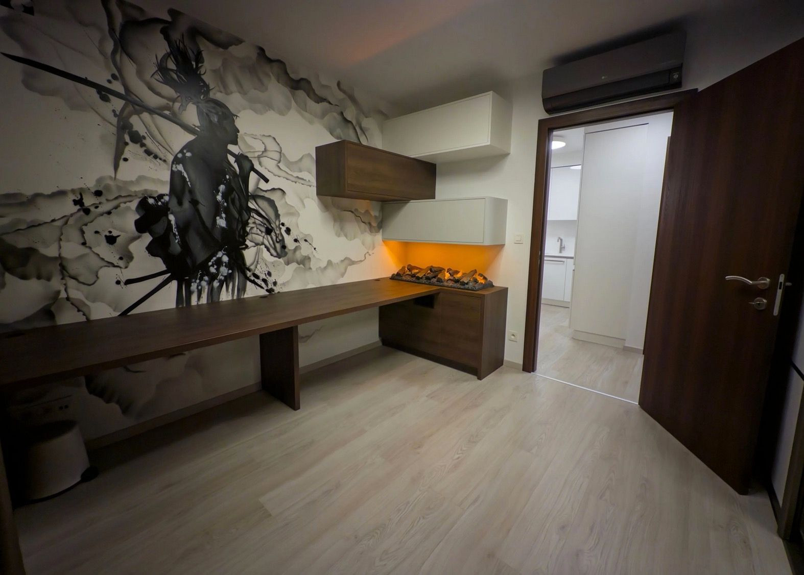 Dizajnová pracovňa v japonskom štýle s „hotelovým krbom (zvlhčovač, aróma, zvuk ohňa).