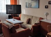 - obývačka so sedačkou a veľkým TV